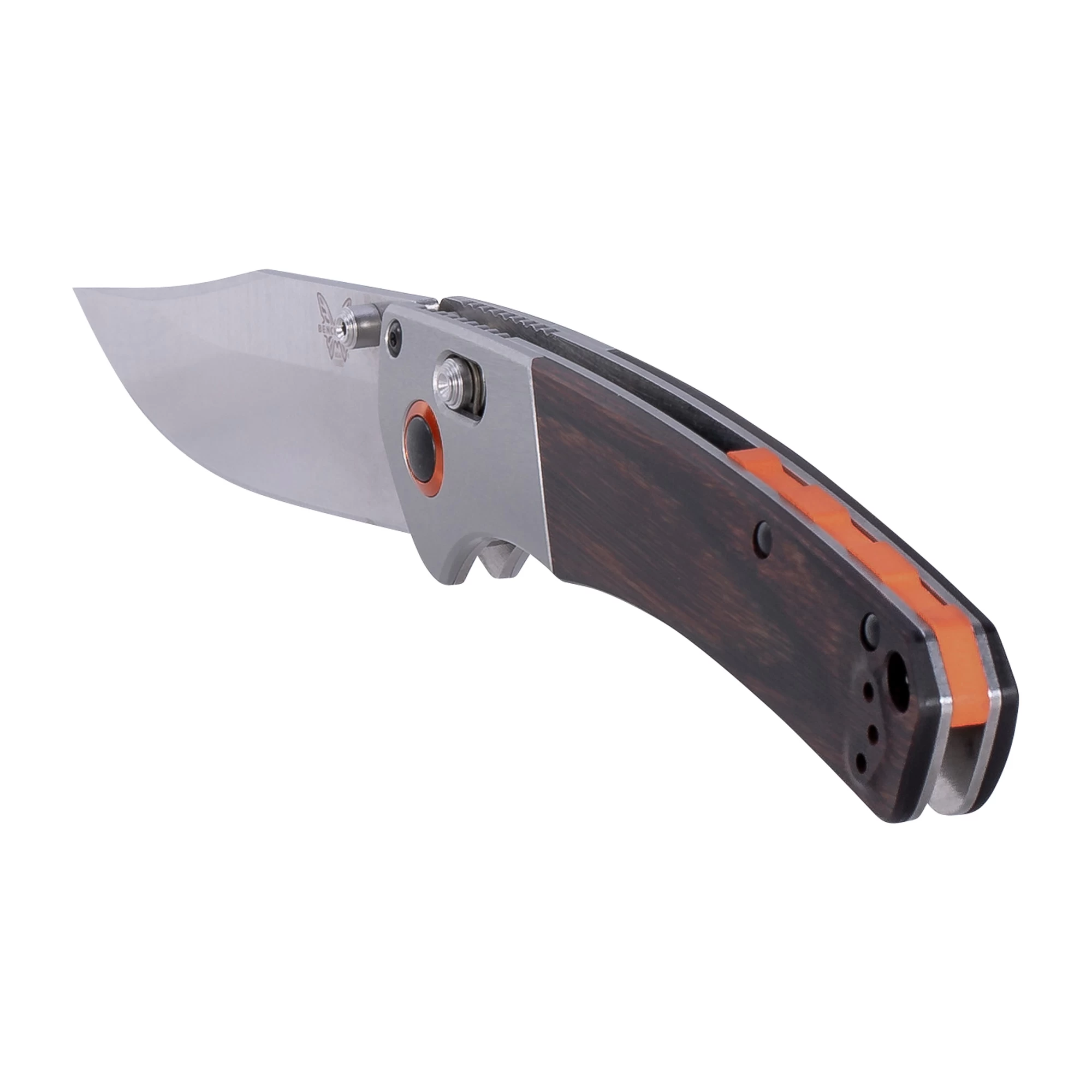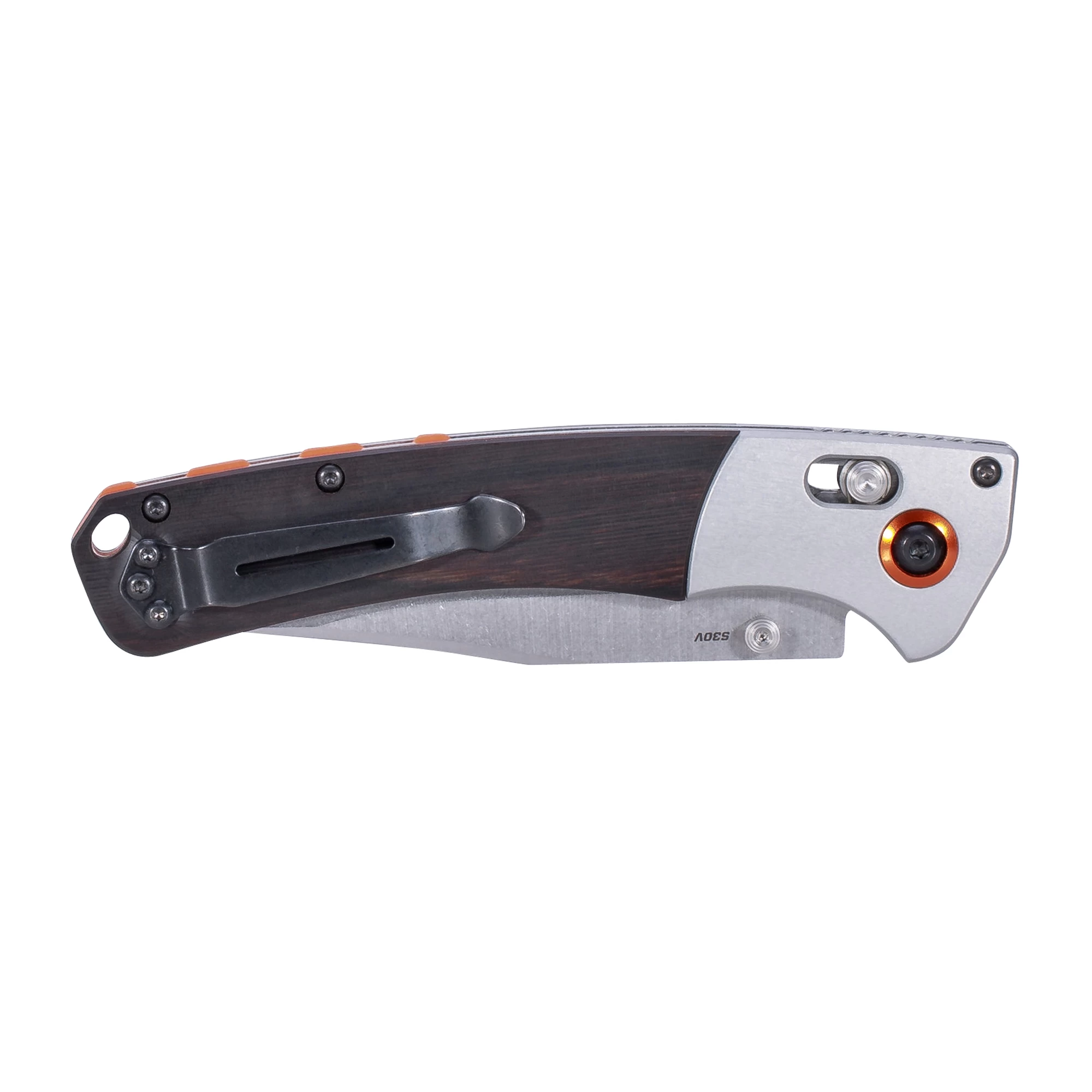 Das Crooked River aus dem Hause Benchmade ist ein Teil der HUNT Serie und verbindet das klassische mit dem modernen Design. Hierfür wurden Dymondwood Griffschalen mit einer satinierten Clip-Point Klinge kombiniert und an der Klingenschraube sowie an den Spacern orangene Farbelemente gesetzt. Dabei gehört das Crooked River mit einer Klingenlänge von über 10 cm zu den größeren Taschenmessern und ist mit dem patentierten AXIS Look System ausgestattet.