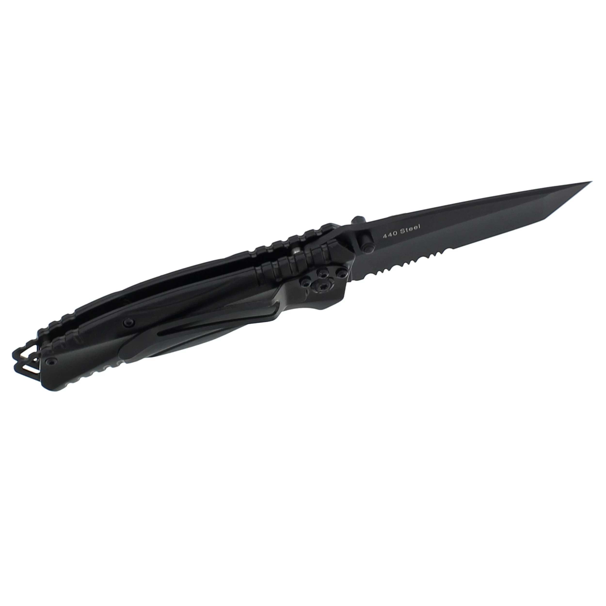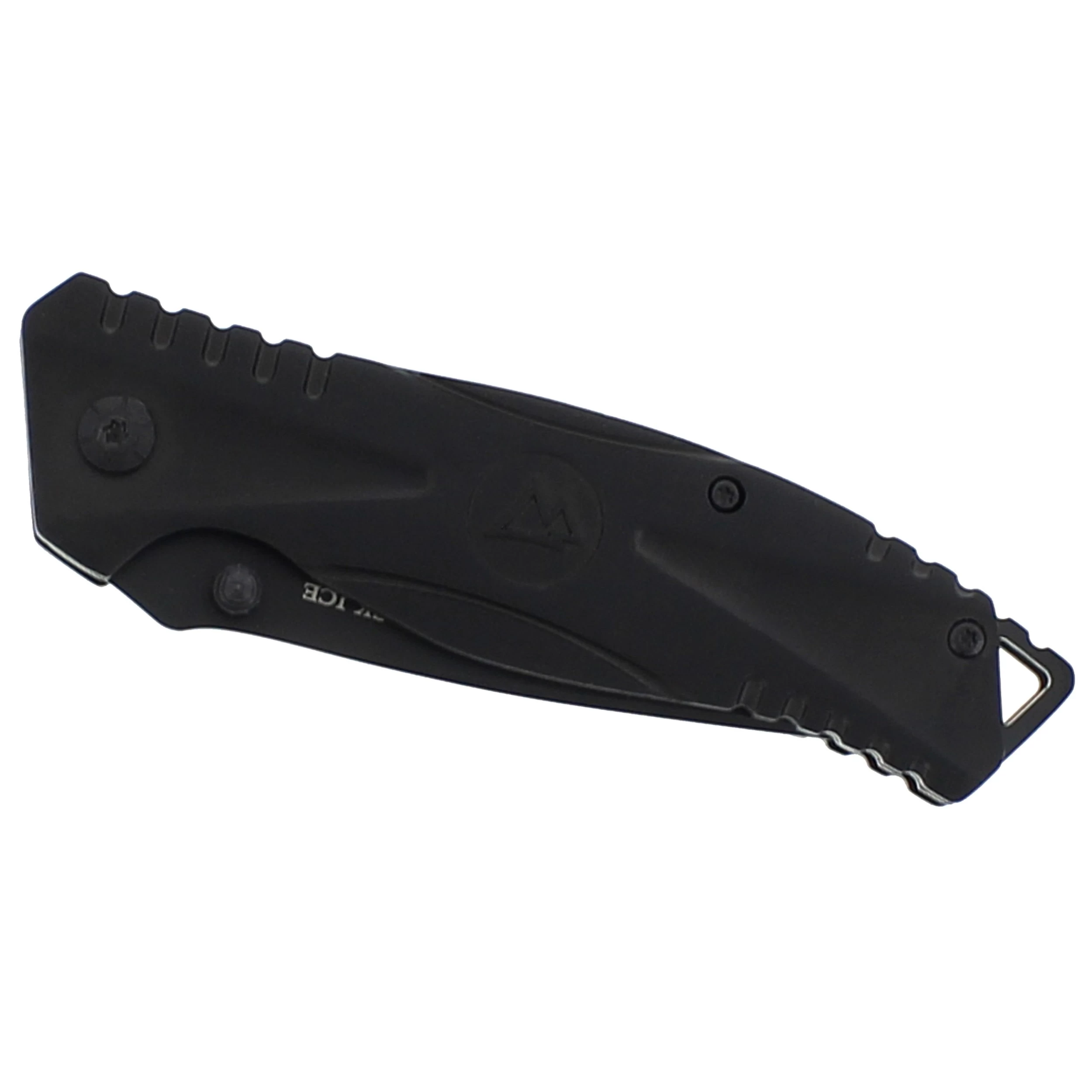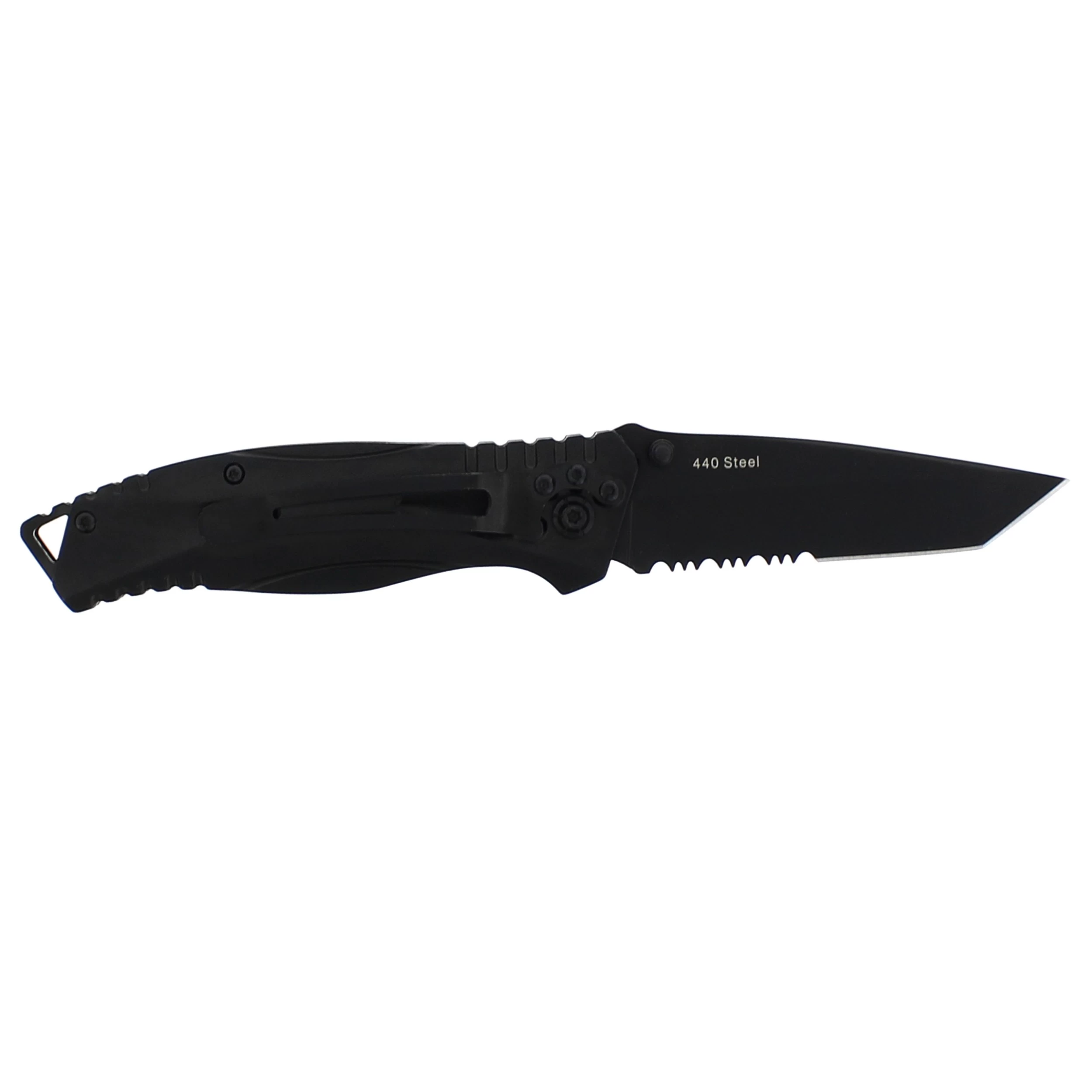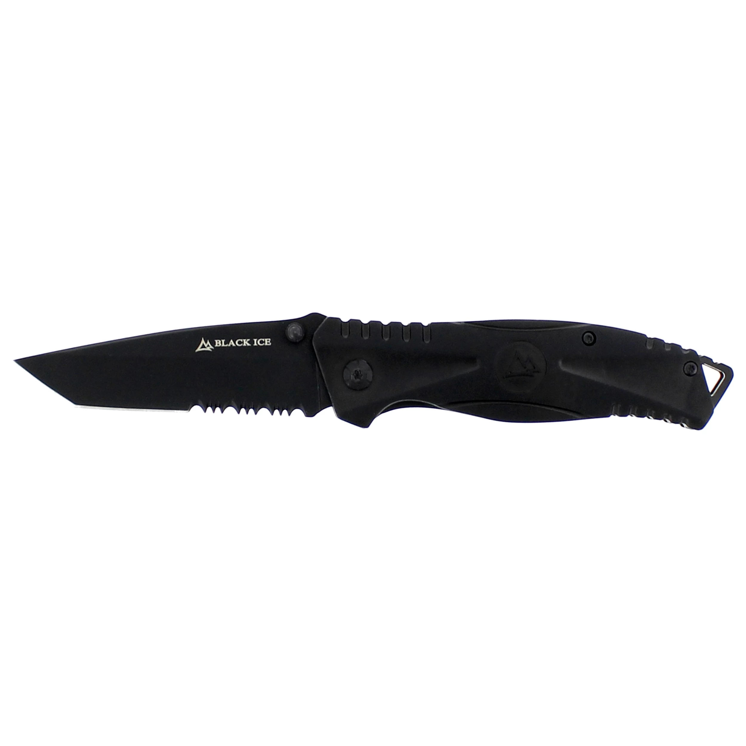 Hochwertiges Taschenmesser von Black Ice mit abnehmbarem Einhand-Pin. Die modifizierte Tantoklinge mit Teilsägezahnung liefert gute Schnittergebnisse. Der ergonomische Griff liegt sicher in der Hand. Am Griffende befindet sich ein Glasbrecher, an dem auch eine Halteschlaufe befestigt werden kann.