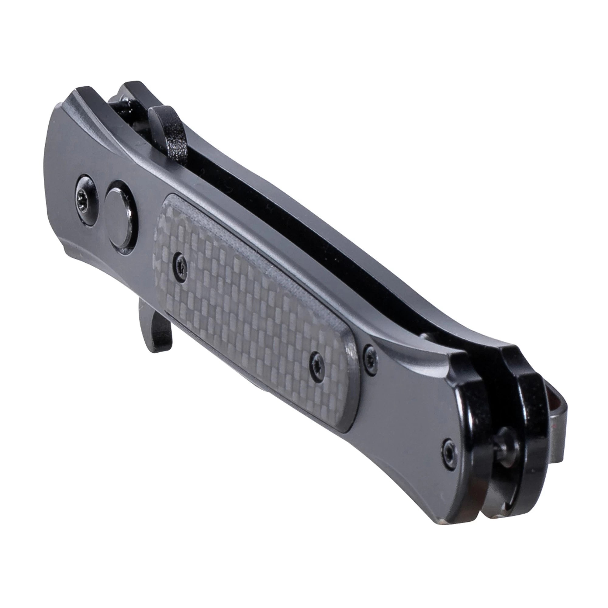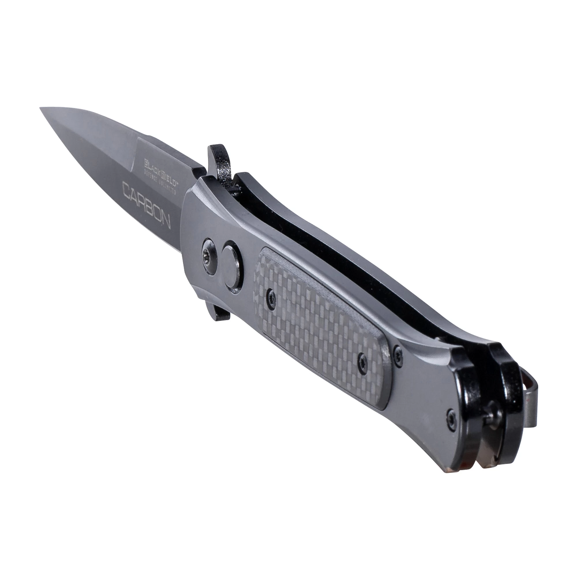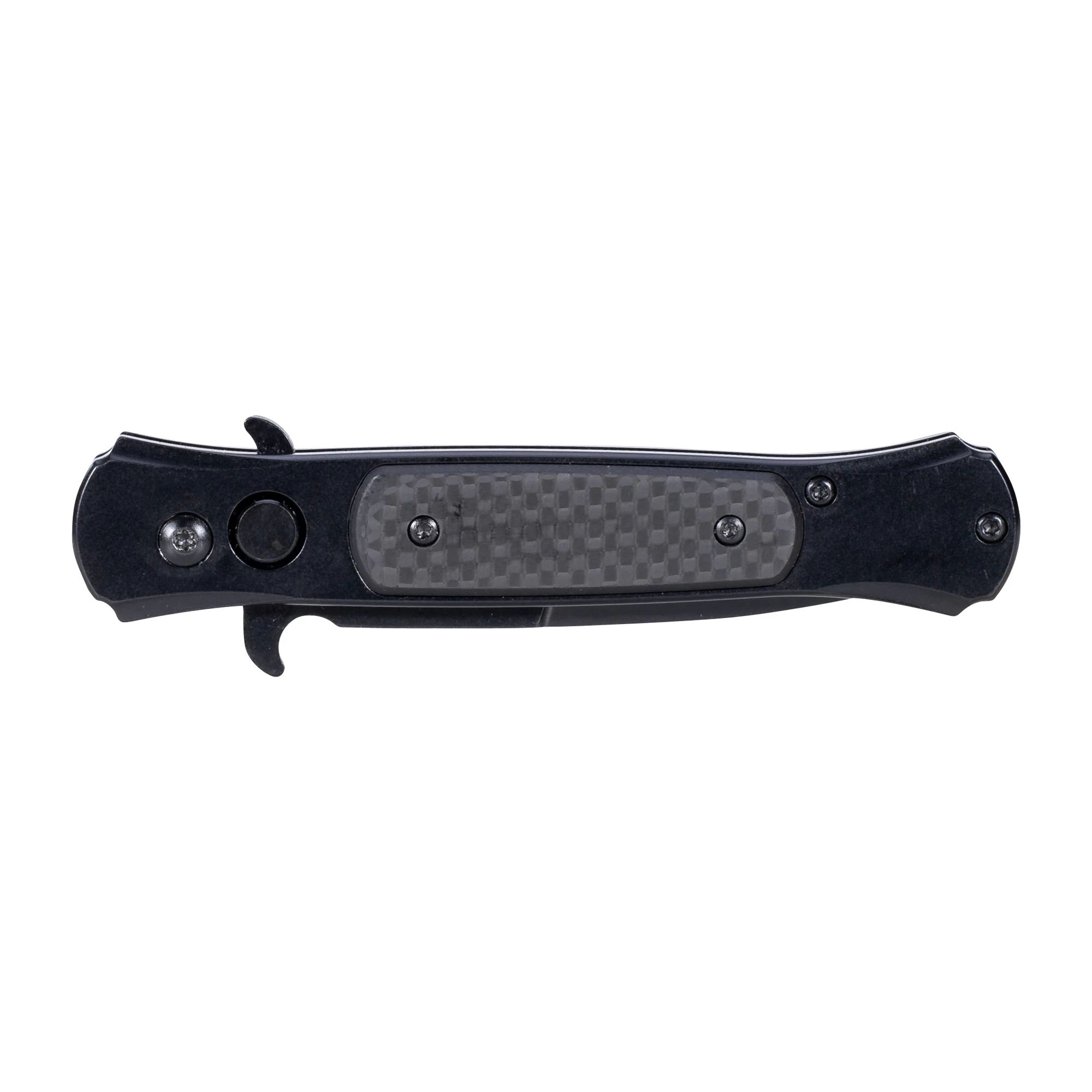 Ein elegantes und dennoch hochwertiges Springmesser von BlackField mit einer einseitig geschliffenen Klinge aus 440er rostfreiem Stahl. Die Griffbeschalung aus Leichtmetall ist mit einer optisch ansprechenden Einlage aus Carbonfasern ausgestattet. Das Messer ist sehr einfach zu bedienen, da die Klinge mit einem einzigen Knopfdruck seitlich aus dem schwarzen Metall-Heft heraus federt. Mit praktischem Gürtelclip.
