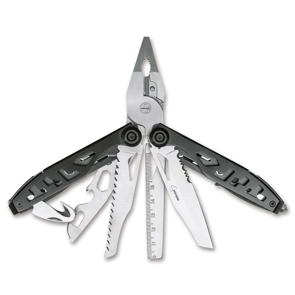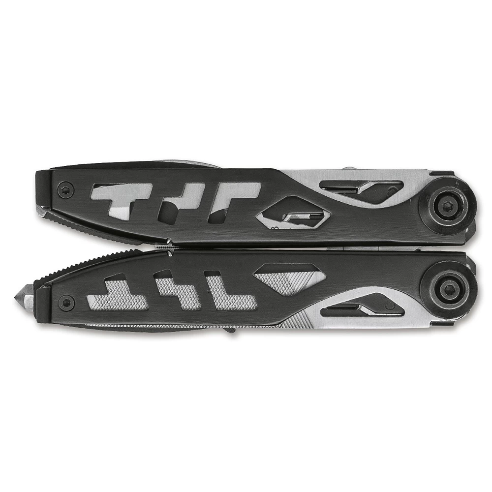 Das Böker Plus Multitool Specialist II ist eine perfekte Ergänzung zu Ihrer Ausrüstung und überzeugt im Alltag ebenso wie im Einsatz oder im Outdoor-Bereich. Die federunterstützte Zange ist mit einem verstärkten Drahtschneider ausgestattet und verfügt zusätzlich über die flache Greiffläche einer Spitzzange. Dank des Brennerlochs ist das Greifen von Außensechskantschrauben, Überwurfmuttern und Rohren problemlos möglich. Weitere in den beiden Griffkörpern untergebrachte Werkzeuge lassen sich leichtgängig öffnen und können aufgrund der stabilen Linerlock-Verriegelung sicher eingesetzt werden. Zwei beidseitige Bits, ein entsprechender Bithalter und ein praxistauglicher Glasbrecher vervollständigen die Ausstattung.