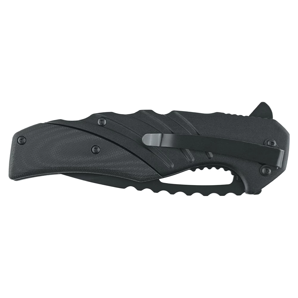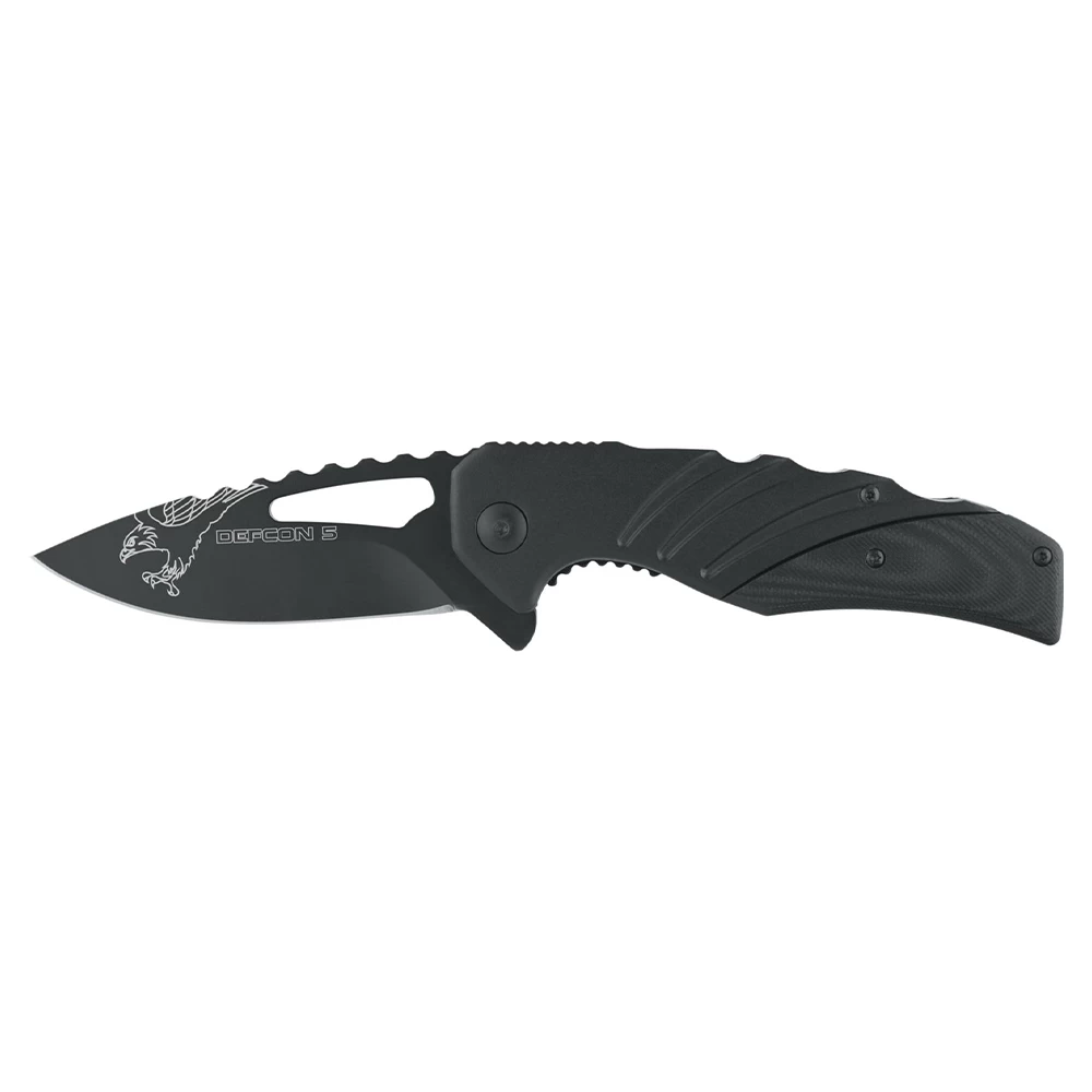Das praktische Defcon 5 Taschenmesser Tactical Folding Knife Delta schwarz setzt sich aus einem schwarzen Aluminium- und G-10-Griff und einer stabilen, oxidbeschichteten Klinge mit Daumenausschnitt aus 8Cr13MOV-Stahl zusammen. Letzteres bringt den Vorteil eines sehr guten Preis-Leistungs-Verhältnisses mit. Der Liner Lock-Verschlussmechanismus macht den Gebrauch sicher, während der integrierte Daumenbolzen das Öffnen des taktischen Klappmessers erleichtert. Der Taschenclip und das Defcon 5-Logo auf der Klinge runden dieses Tool perfekt ab.