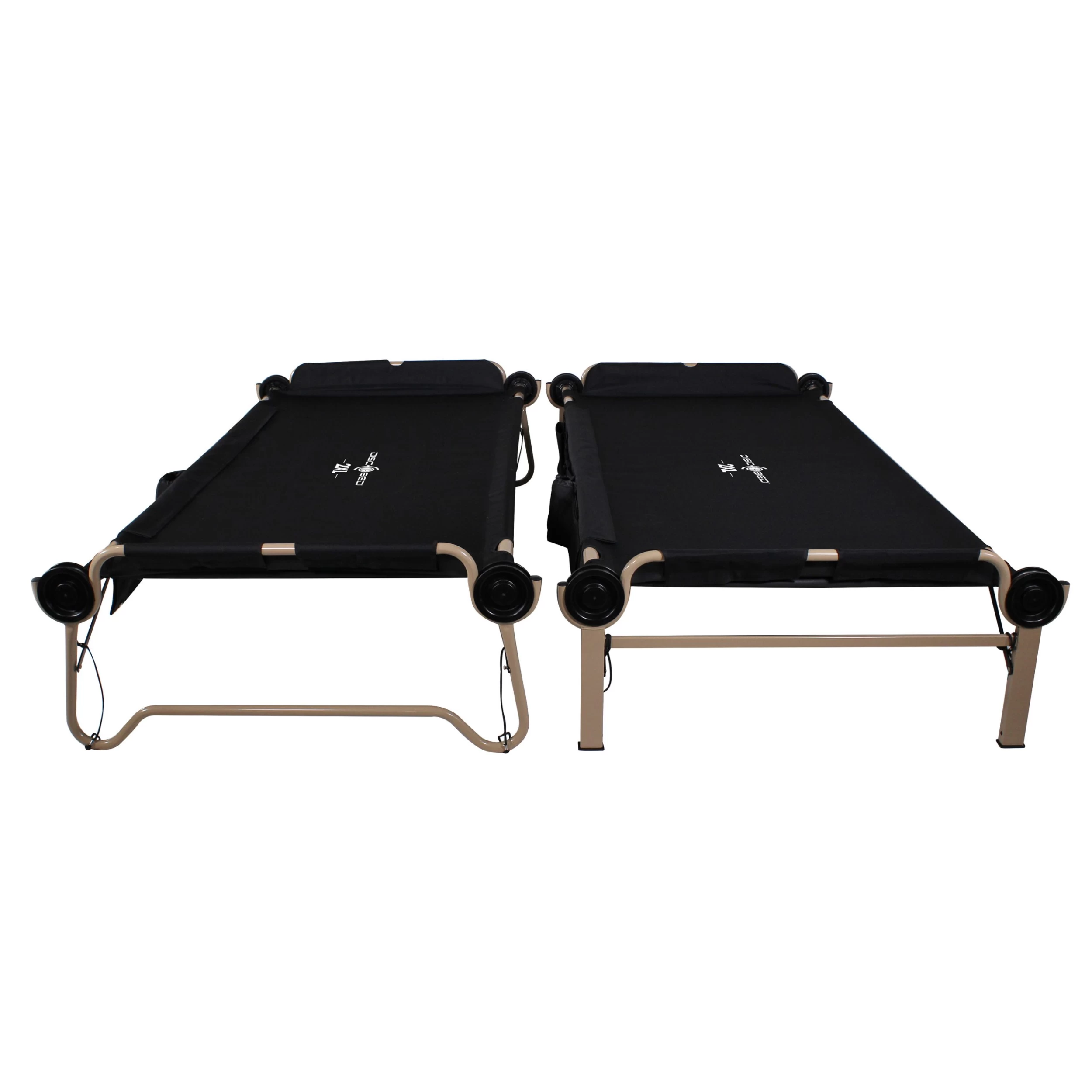 Mit dem Disc-O-Bed 2XL erhalten Sie ein Luxus-Feldbett in Überlänge für alle großen Personen, die ein bequeme Schlafgelegenheit suchen. Es bietet dank der durchdachten Etagenbett-Konstruktion Platz für 2 Personen auf geringem Raum und kann wahlweise auch als Sitzbank mit Rückenlehne oder als zwei Einzelbetten verwendet werden. Das 2-Personen-Feldbett ist dank des patentierten Disc-Systems mit wenigen Handgriffen und ohne gesondertes Werkzeug zusammenzubauen und bietet dank Verzicht auf zusätzliche Querstangen einen erhöhten Liegekomfort. In den Seitentaschen, die an der Matte befestigt werden, können Sie persönliche Gegenstände wie Brille, Handy oder auch Taschenlampe und Getränk für einen schnellen Zugriff verstauen.