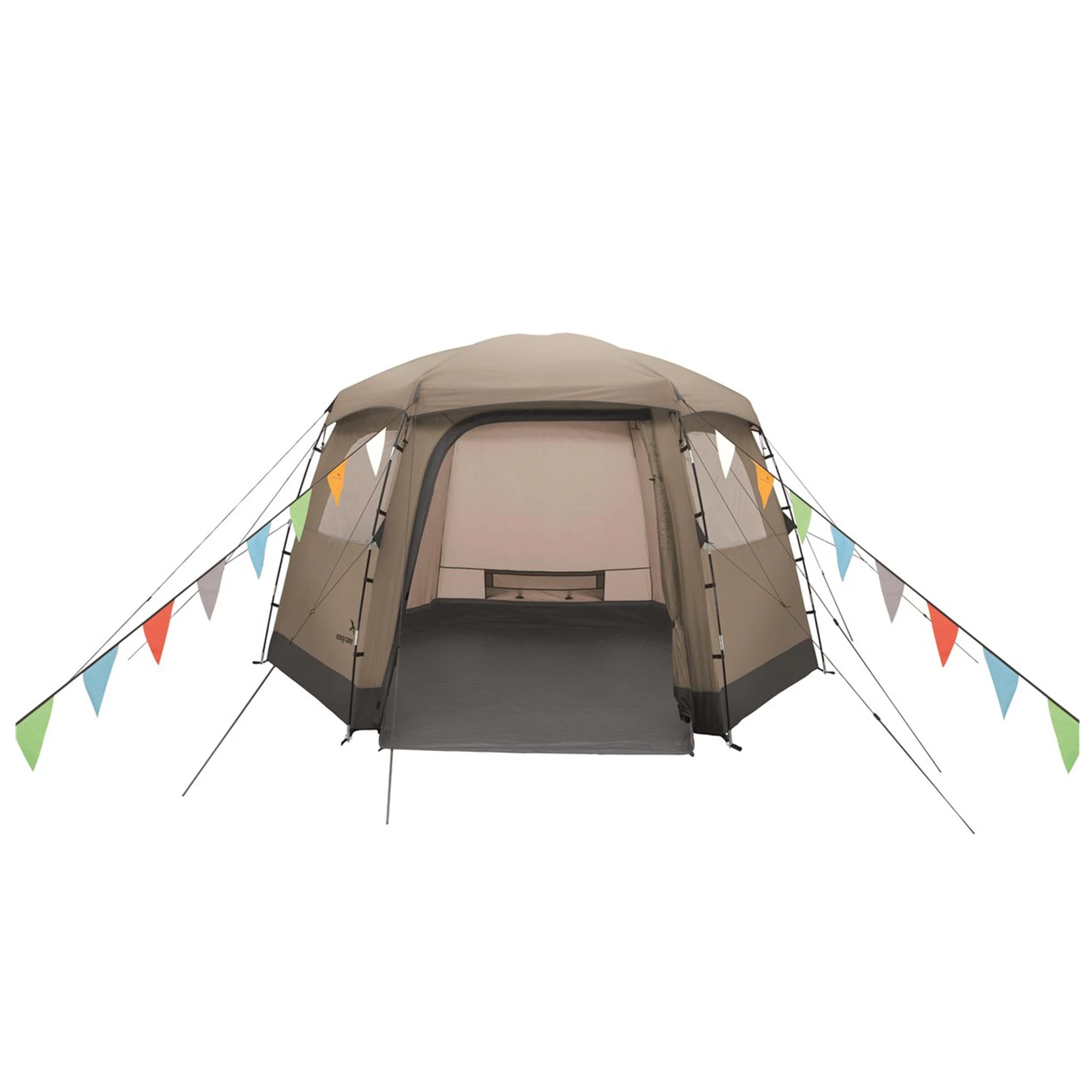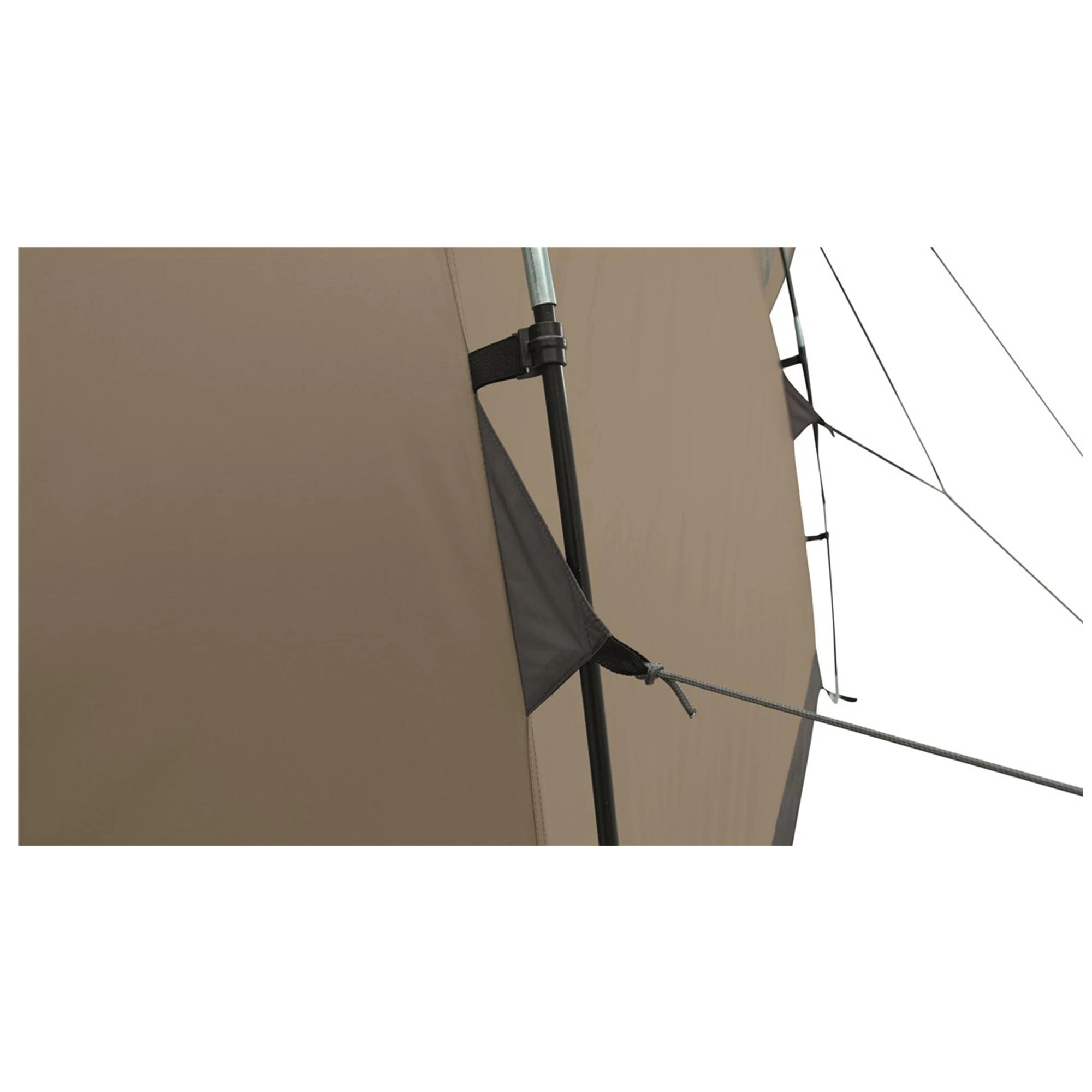 PVC Fenster sorgen für Licht im Inneren, können aber auch mit aufrollbaren Vorhängen verdunkelt werden. Der große faltbare Eingang wird mit Zwei-Wege-Reißverschlüssen gesichert und kann flexibel geöffnet werden. Mit großen Netzstoff-Einsätzen unter dem Überzelt sowie einem Netzfenster in der Tür kann die Luft zirkulieren, Mücken und andere Insekten bleiben jedoch draußen.