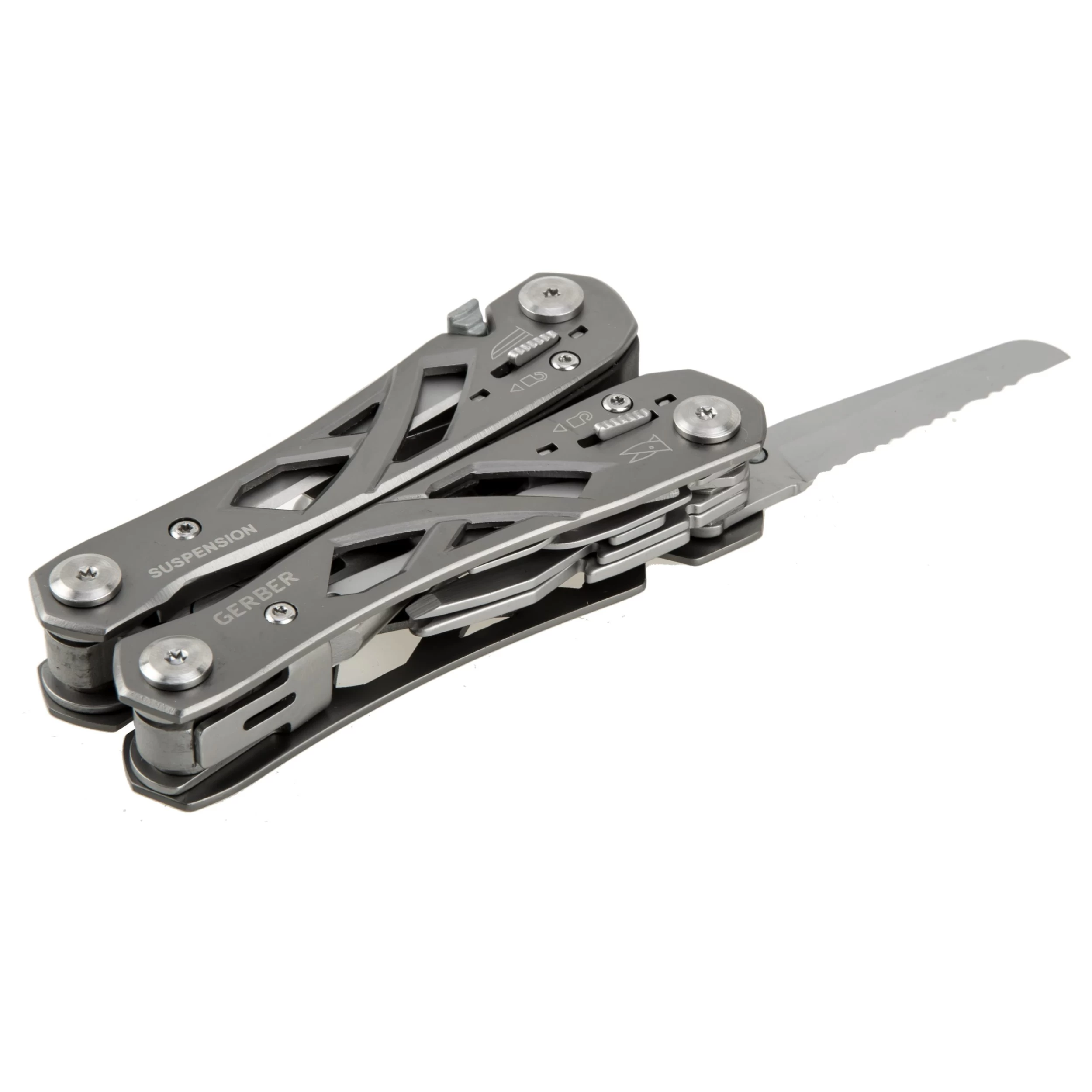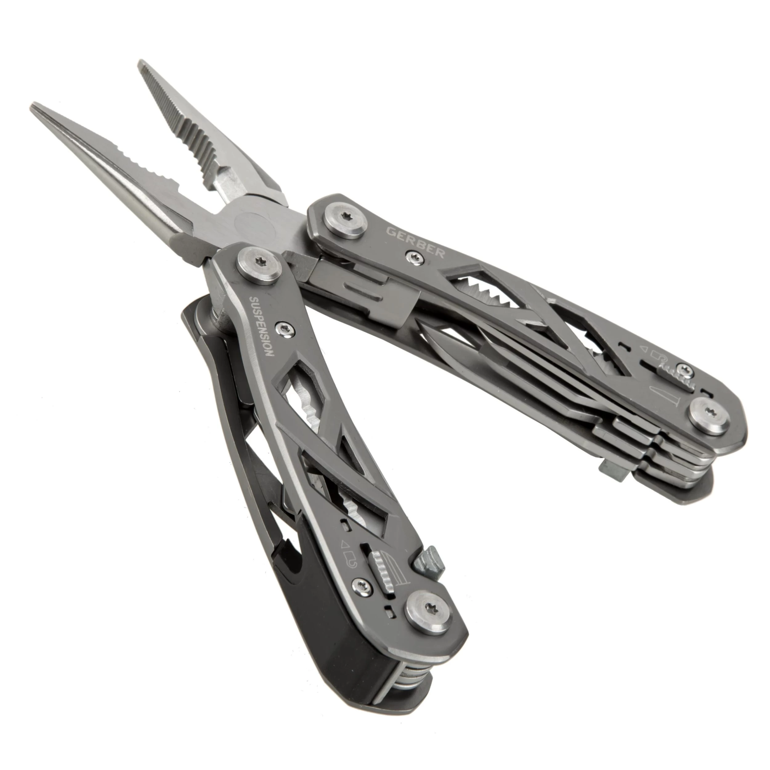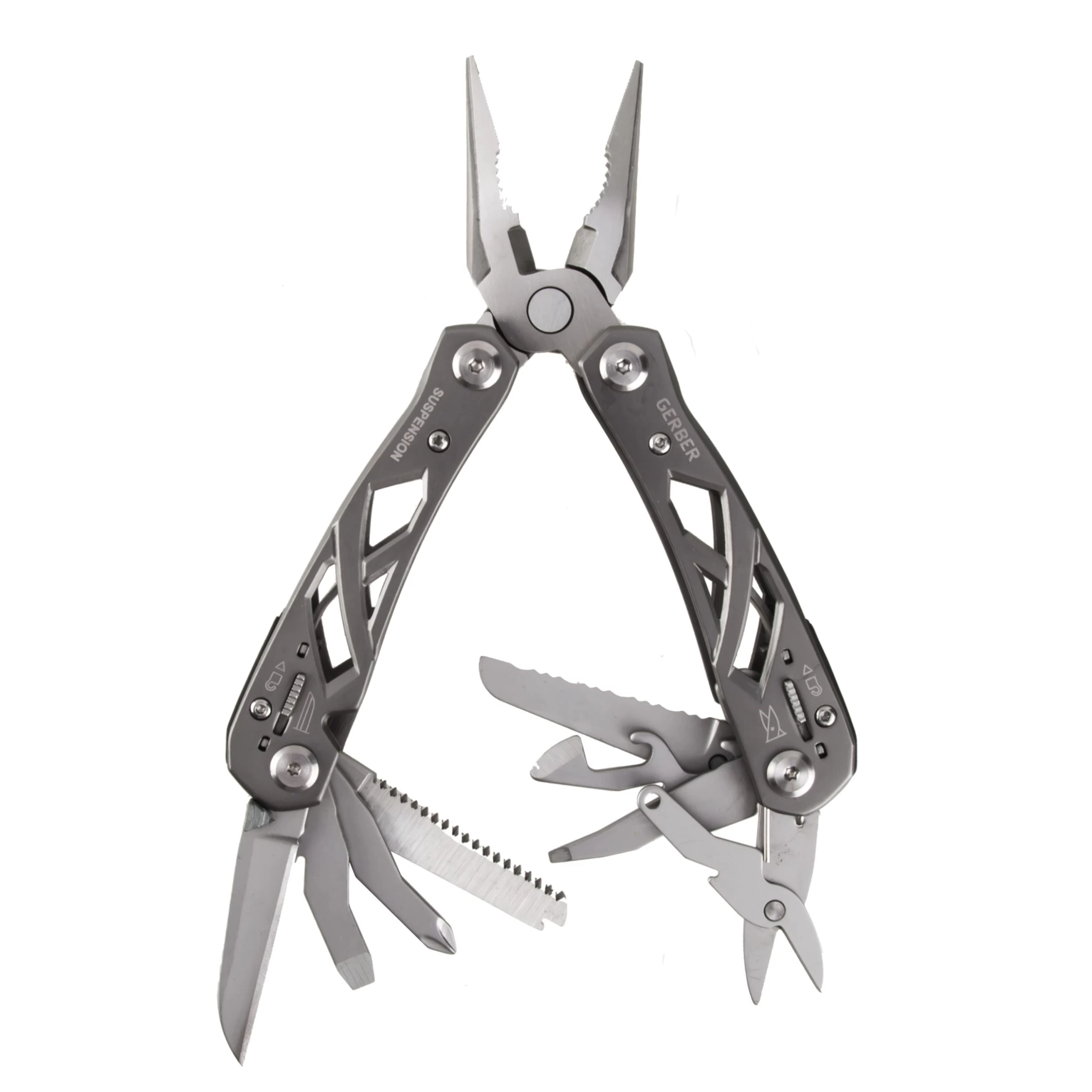 Die Zange des Gerber Multitools Suspension lässt sich kinderleicht aufklappen und anschließend komfortabel handhaben. Dazu trägt maßgeblich die integrierte Federung bei. Ungemein praktisch sind auch die 9 außen liegenden Werkzeuge, darunter Schere, Säge, Klinge, Flaschenöffner und Schraubendreher. Alle Werkzeuge sind feststellbar und lassen sich nach Gebrauch durch Schieber am Griff wieder bequem entriegeln. Der skelettartige Griff spart Gewicht ein und gibt den Blick nach innen frei. Inklusive stabiler Nylonscheide mit Gürtelschlaufe.