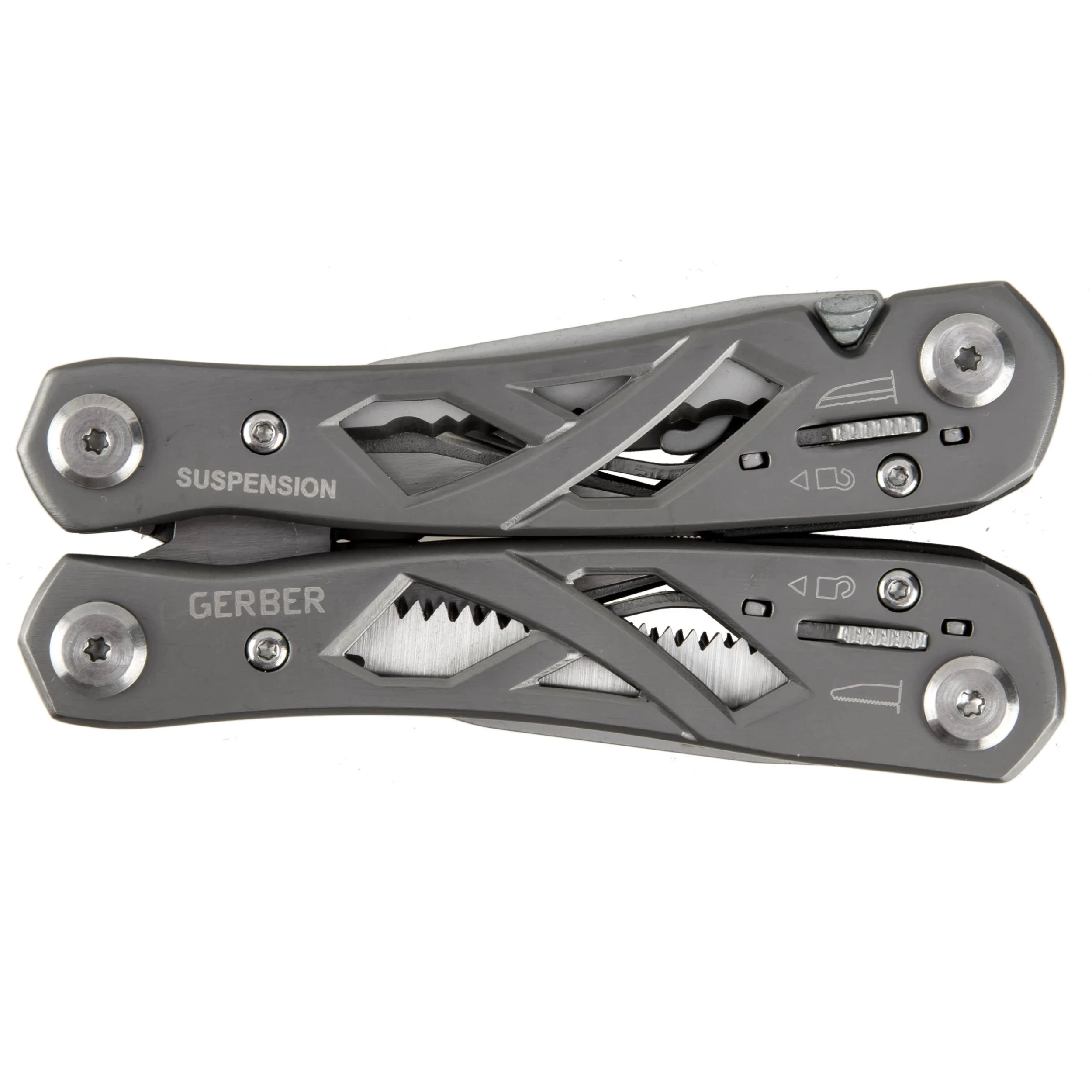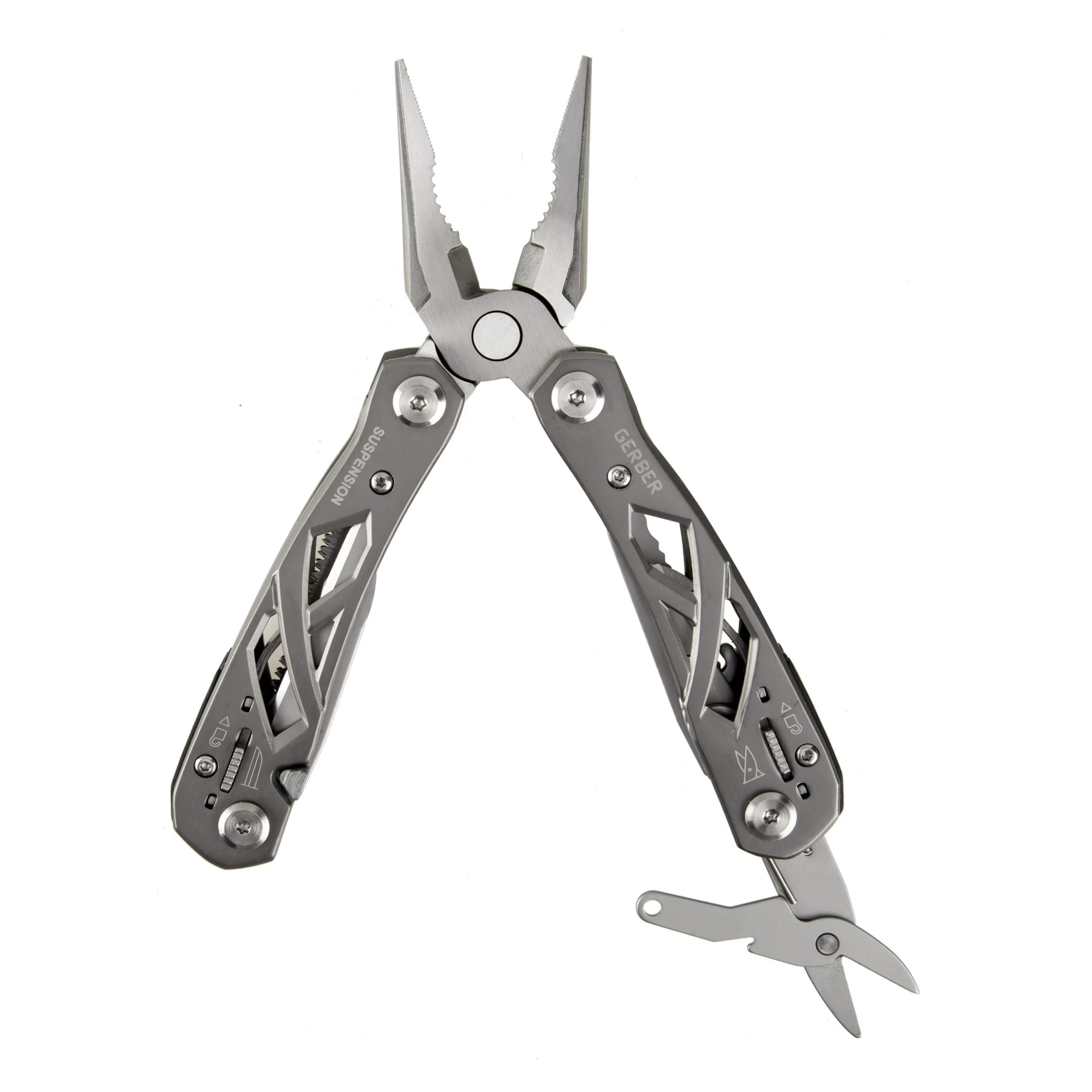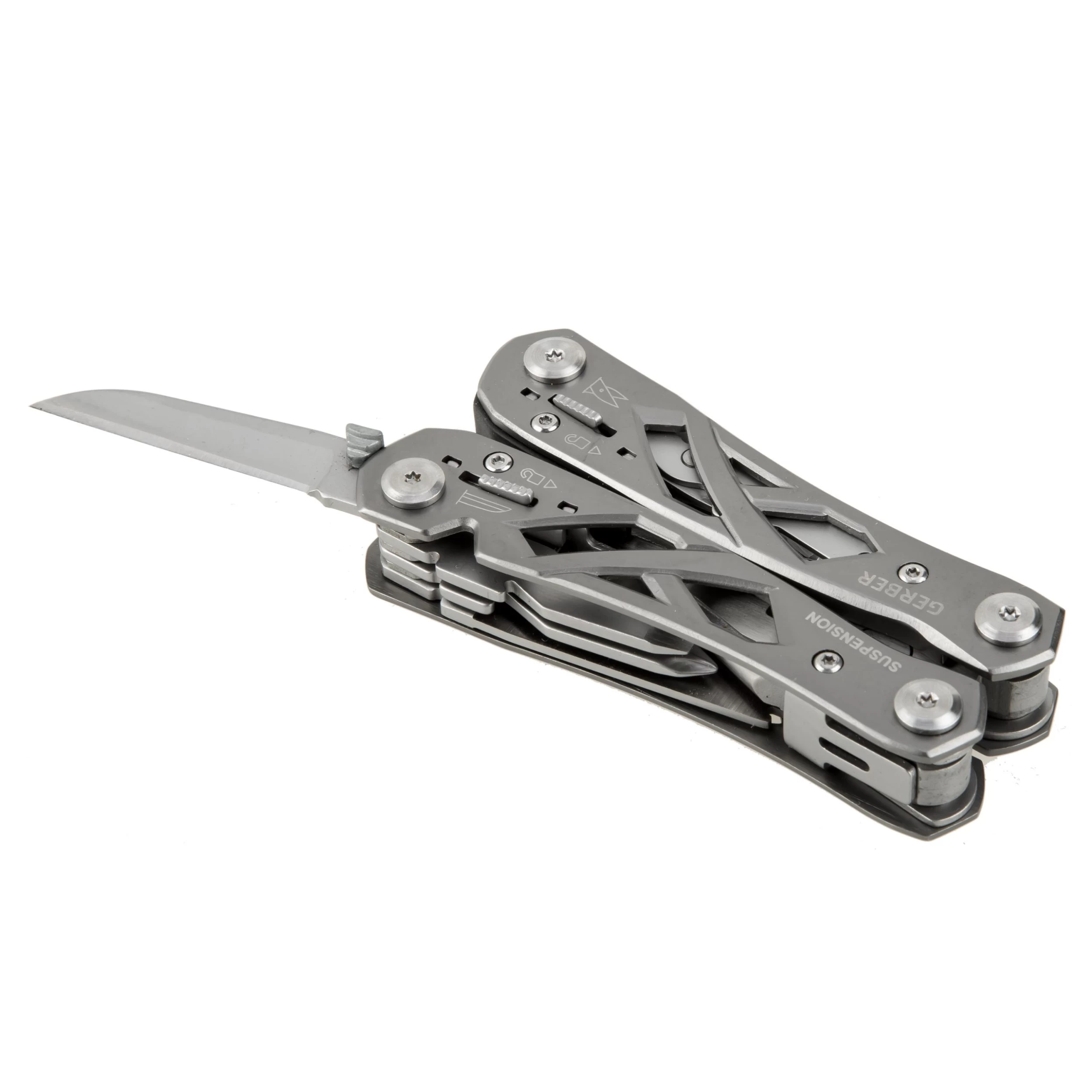 Die Zange des Gerber Multitools Suspension lässt sich kinderleicht aufklappen und anschließend komfortabel handhaben. Dazu trägt maßgeblich die integrierte Federung bei. Ungemein praktisch sind auch die 9 außen liegenden Werkzeuge, darunter Schere, Säge, Klinge, Flaschenöffner und Schraubendreher. Alle Werkzeuge sind feststellbar und lassen sich nach Gebrauch durch Schieber am Griff wieder bequem entriegeln. Der skelettartige Griff spart Gewicht ein und gibt den Blick nach innen frei. Inklusive stabiler Nylonscheide mit Gürtelschlaufe.