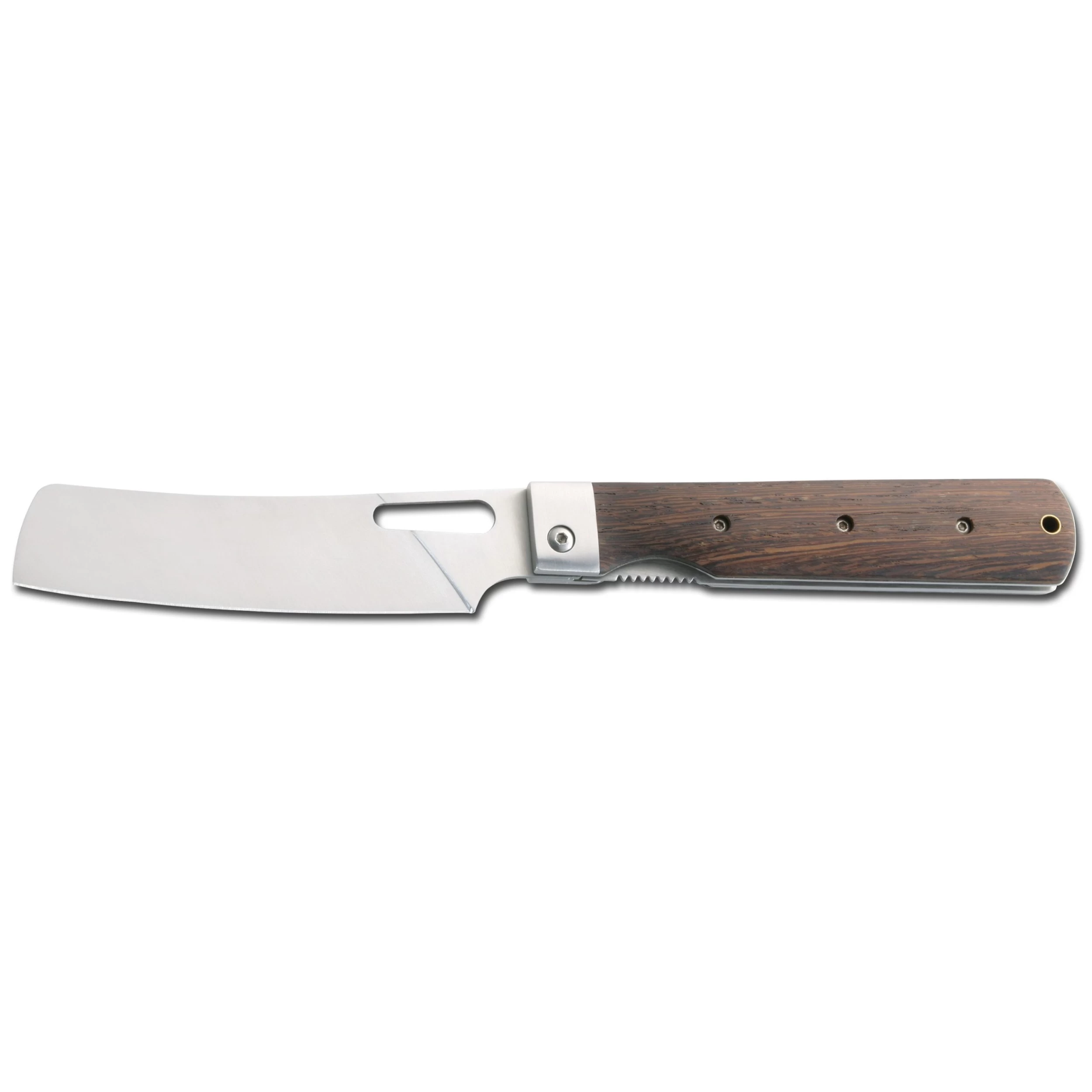 Das praktische Einhandmesser eignet sich besonders für die Outdoor- und Campingküche. Dank des Durchbruchs kann die Klinge sowohl von Rechts- als auch von Linkshändern mit einer Hand geöffnet werden. Im aufgeklappten Zustand arretiert die Klinge im Liner-Lock Verfahren. Der Griff ist mit einer Schale aus Tagayasan-Holz und Edelstahlbeschlägen ausgestattet.