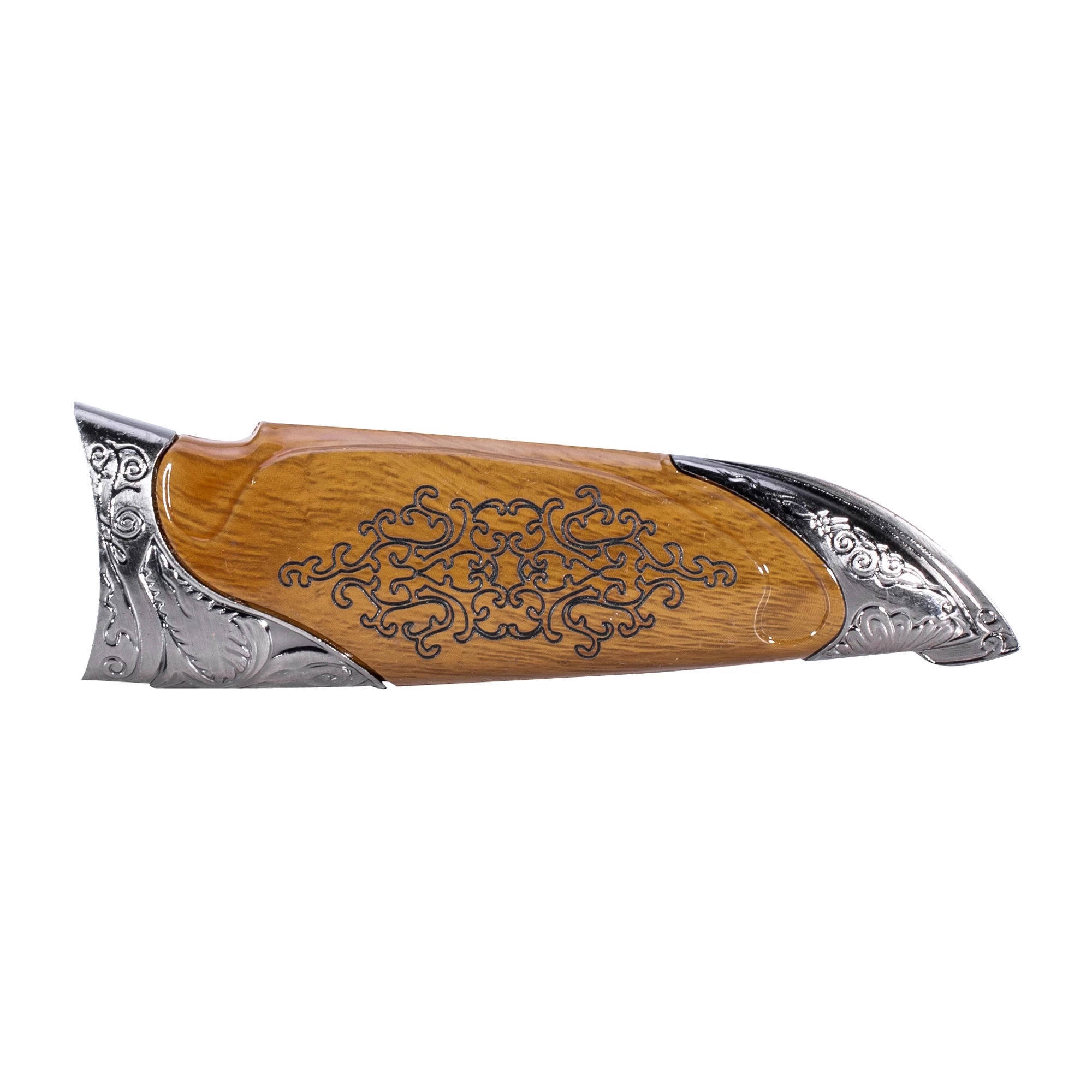 Die Klinge aus AISI 420 Stahl hat ein eingeätztes Damastdesign. Die Steckscheide aus Holzimitat und Leichtmetall zeigt ähnliche Ornamente und Motive wie der Messergriff.