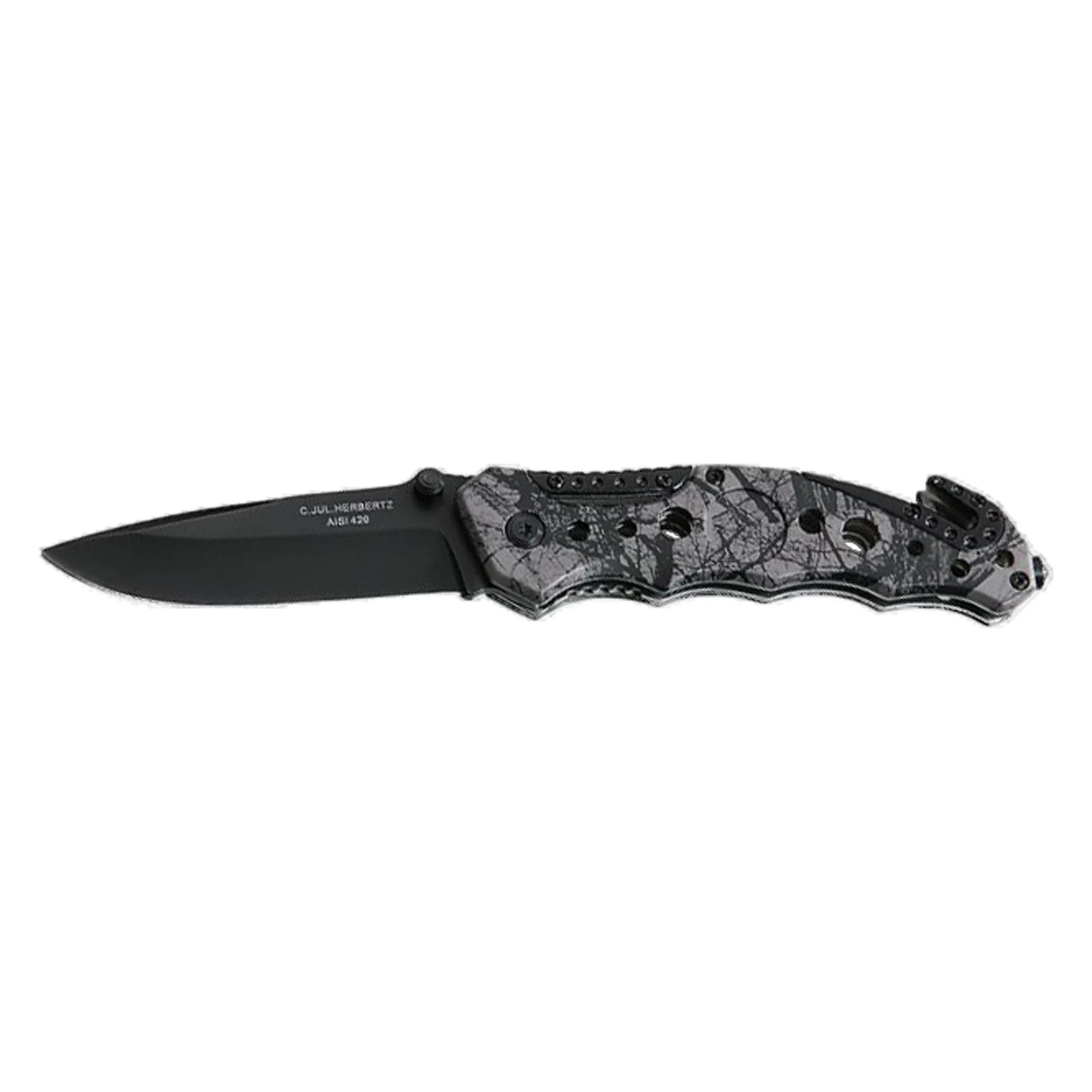 Auffällig designtes Rettungsmesser von Herbertz mit schwarz beschichteter Klinge aus rostfreiem Stahl. Das bewährte Liner Lock System arretiert die Klinge in geöffnetem Zustand zuverlässig. Der grau-schwarze Griff in Camouflage-Optik ist für optimalen Halt ergonomisch geformt. Am Griffende befinden sich ein Glasbrecher und ein Gurtschneider für Notsituationen.