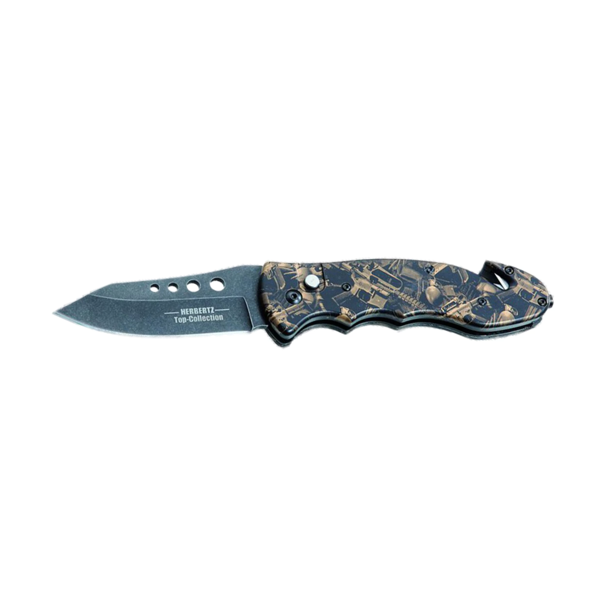 Dieses Springmesser aus der Herbertz Top Collection Reihe wartet mit einigen Extras auf, die sonst eher bei Rettungsmessern verwendet werden- Gurtschneider und Glasbrecher. Die Klinge aus rostfreiem Stahl 440 schnellt nach Betätigung des Kopfs rasant in Arbeitsstellung. Eine Verriegelung im Inneren der beschichteten Aluminium-Griffschalen sichert das Messer vor einem ungewollten Öffnen. Die Griffschalen sind mit einem Muster aus M16-Gewehren verziert. Zum Transport und zur Aufbewahrung dient das beiliegende Etui aus Nylon. Incl. Kunststoff-Box.