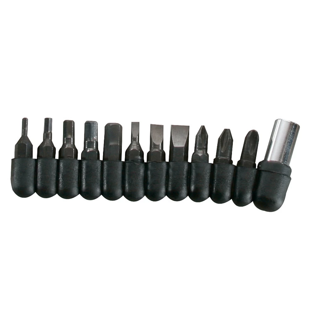 immer wieder gebraucht werden. Der Griff ist mit geriffelten Kunststoffeinlagen versehen und liegt damit satt in der Hand. Inklusive Adapter und 9 Bits sowie einem Nylonetui.