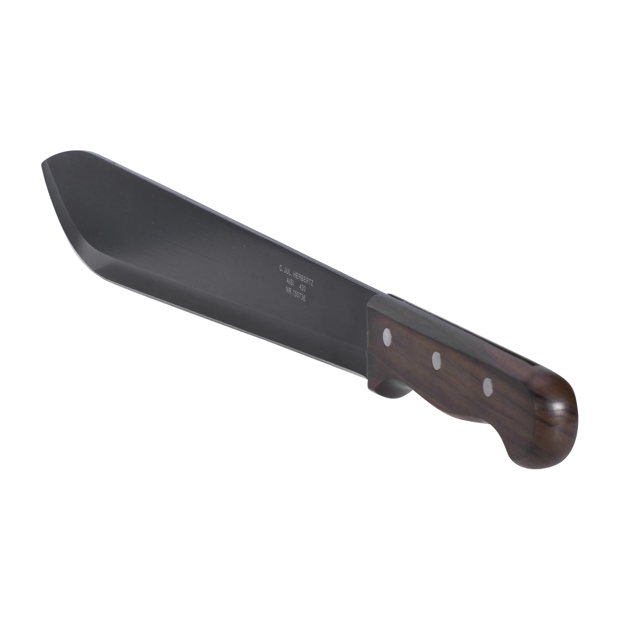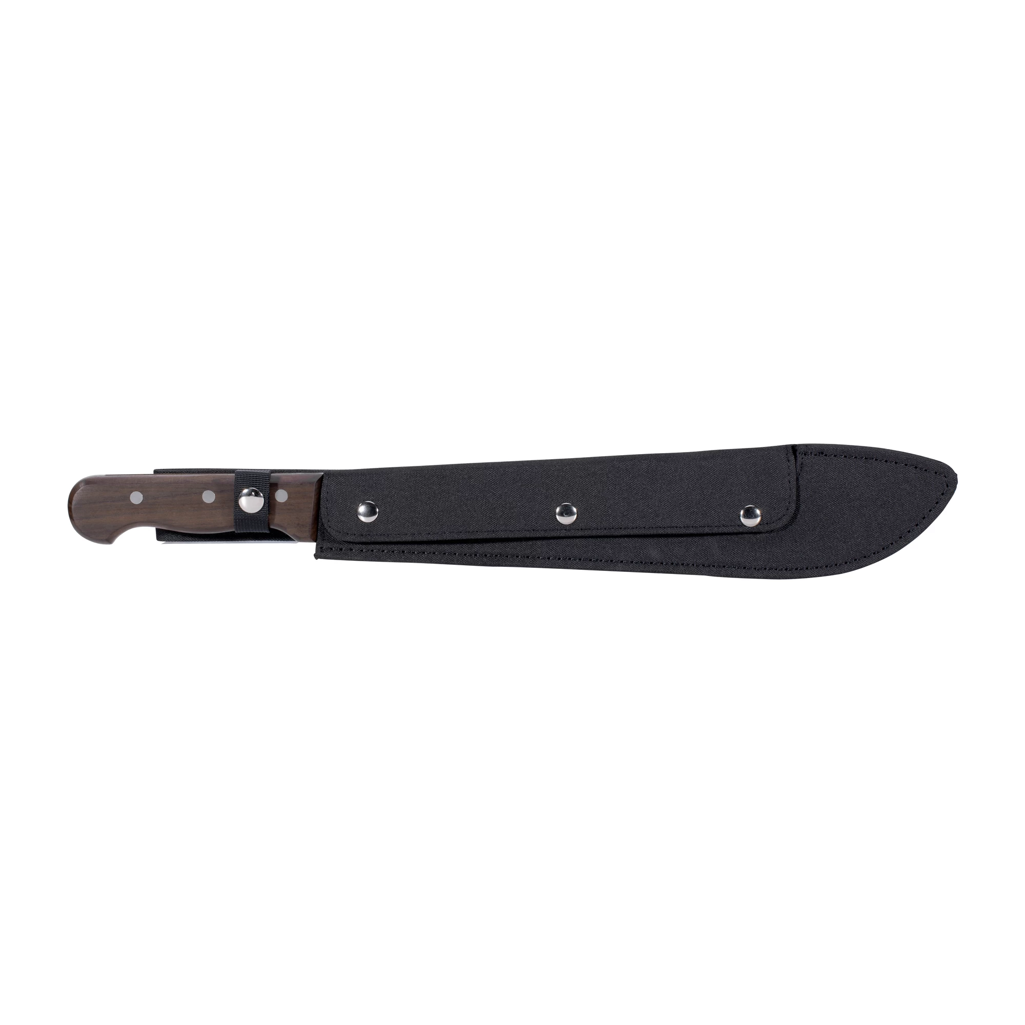 Ein erstklassiges Werkzeug für den harten Gebrauch. Holzgriff mit 3 Nieten. Brünierte, rostfreie Klinge mit einer Länge von 360 mm. Gesamtlänge 51 cm. Inklusive Nylonscheide mit breiter Gürtelschlaufe.
