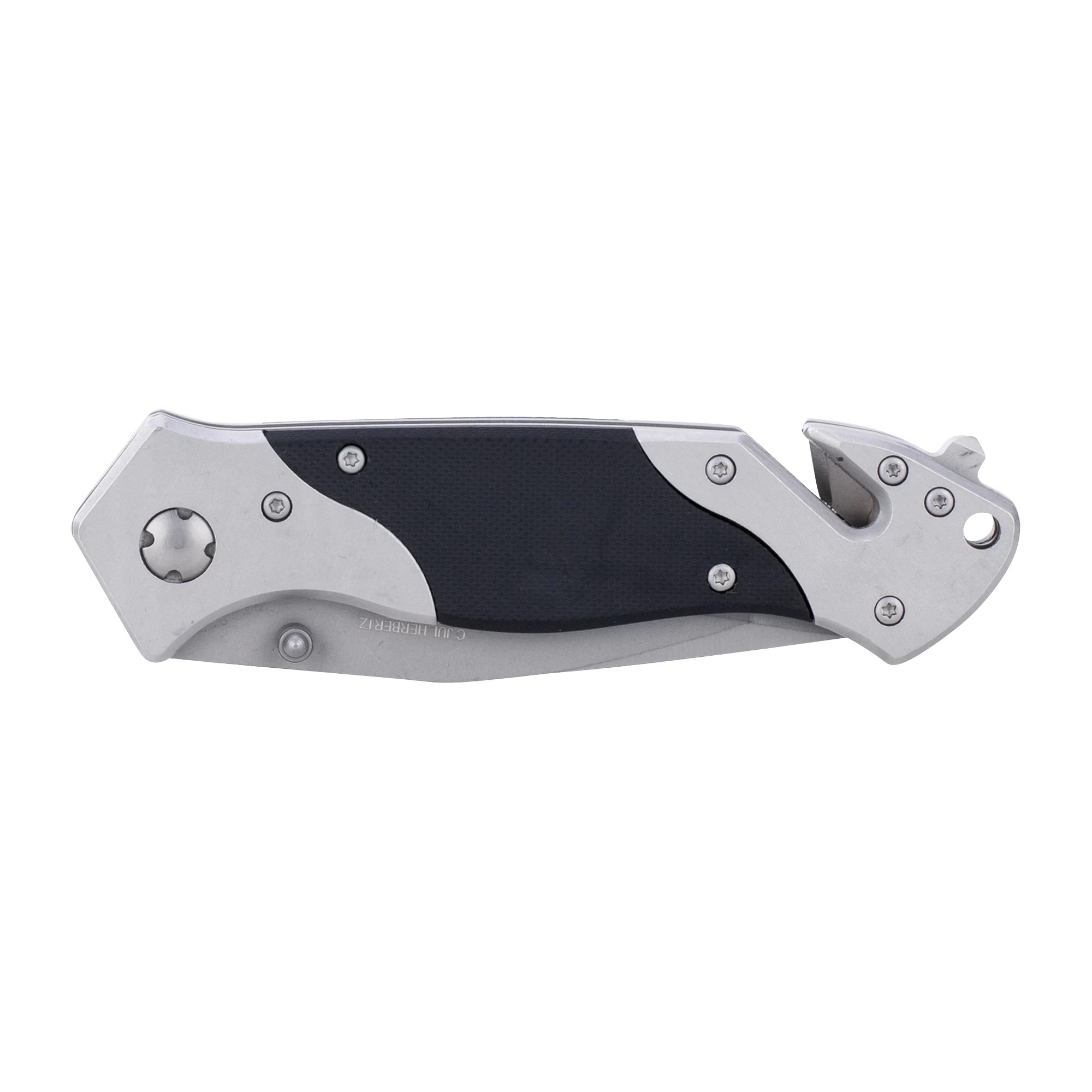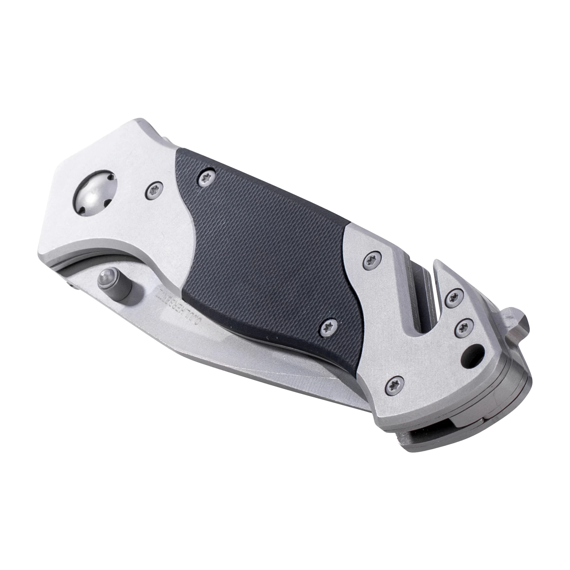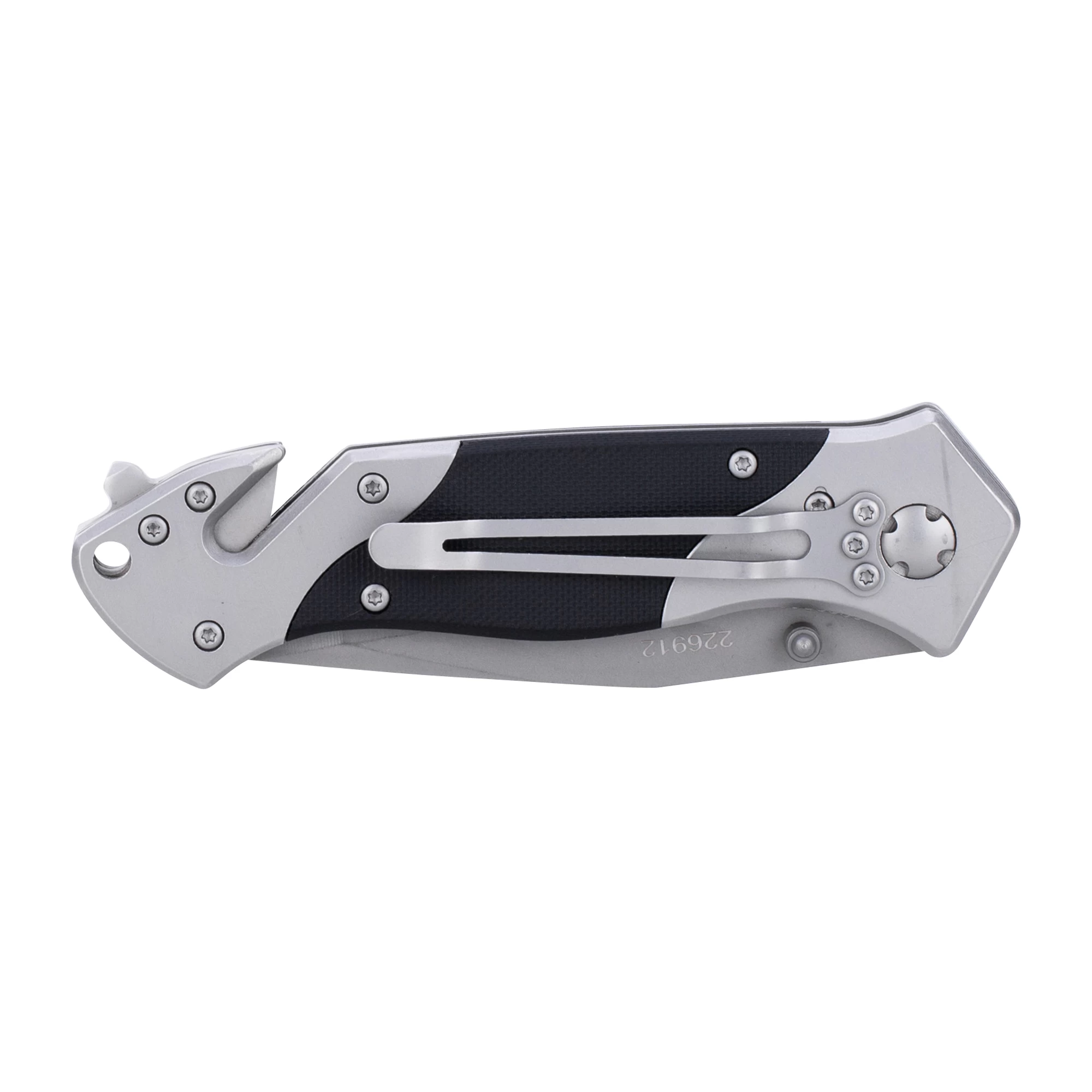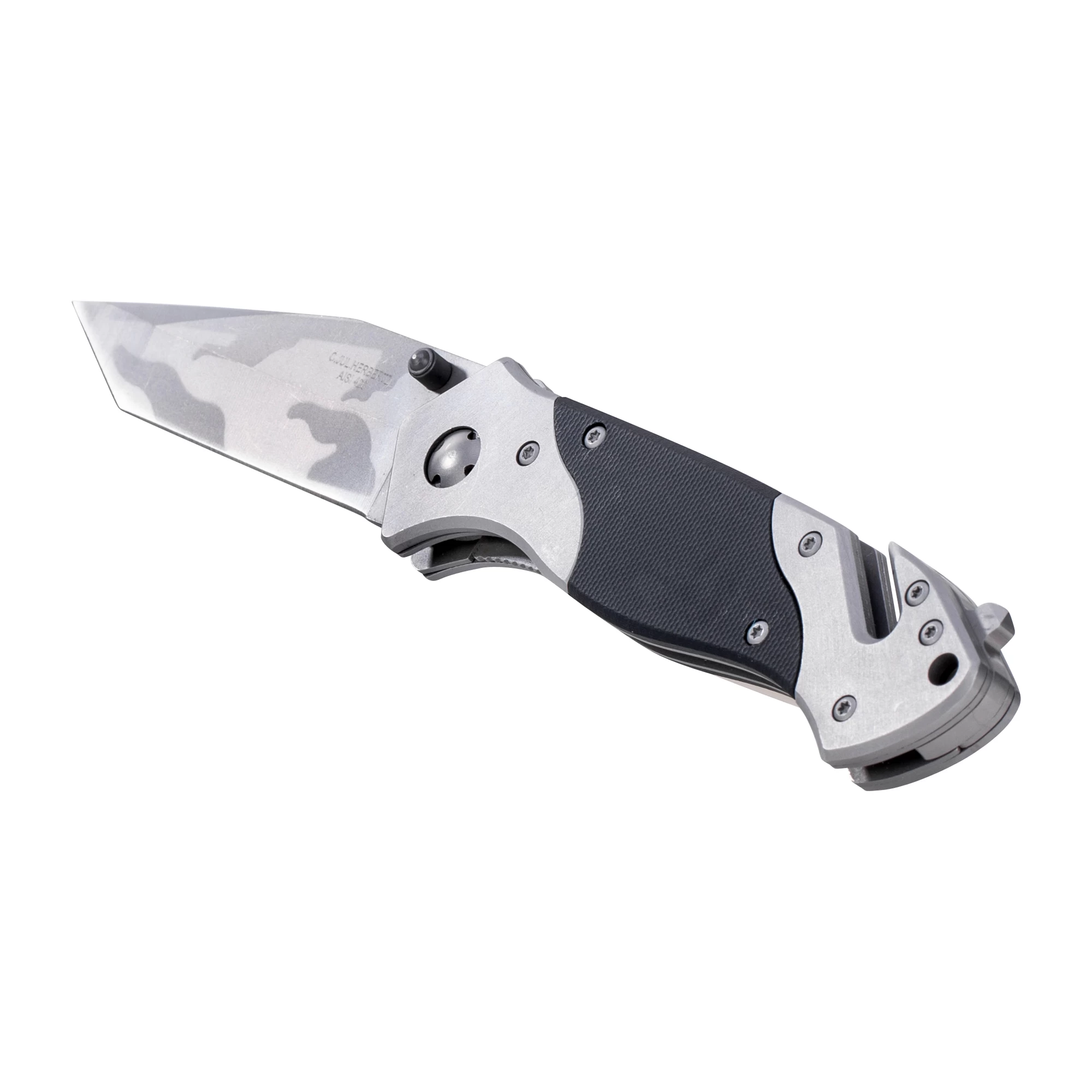 Ein Rettungsmesser mit beidseitiger Einhandbedienung von Herbertz mit einer Klinge im Camo-Design aus rostfreiem 420-er Stahl. Griff aus Edelstahl mit G-10 Einlagen. Am Griffende sind ein Gurtschneider und ein Scheibenzertrümmerer integriert. Gürtelclip aus Edelstahl.