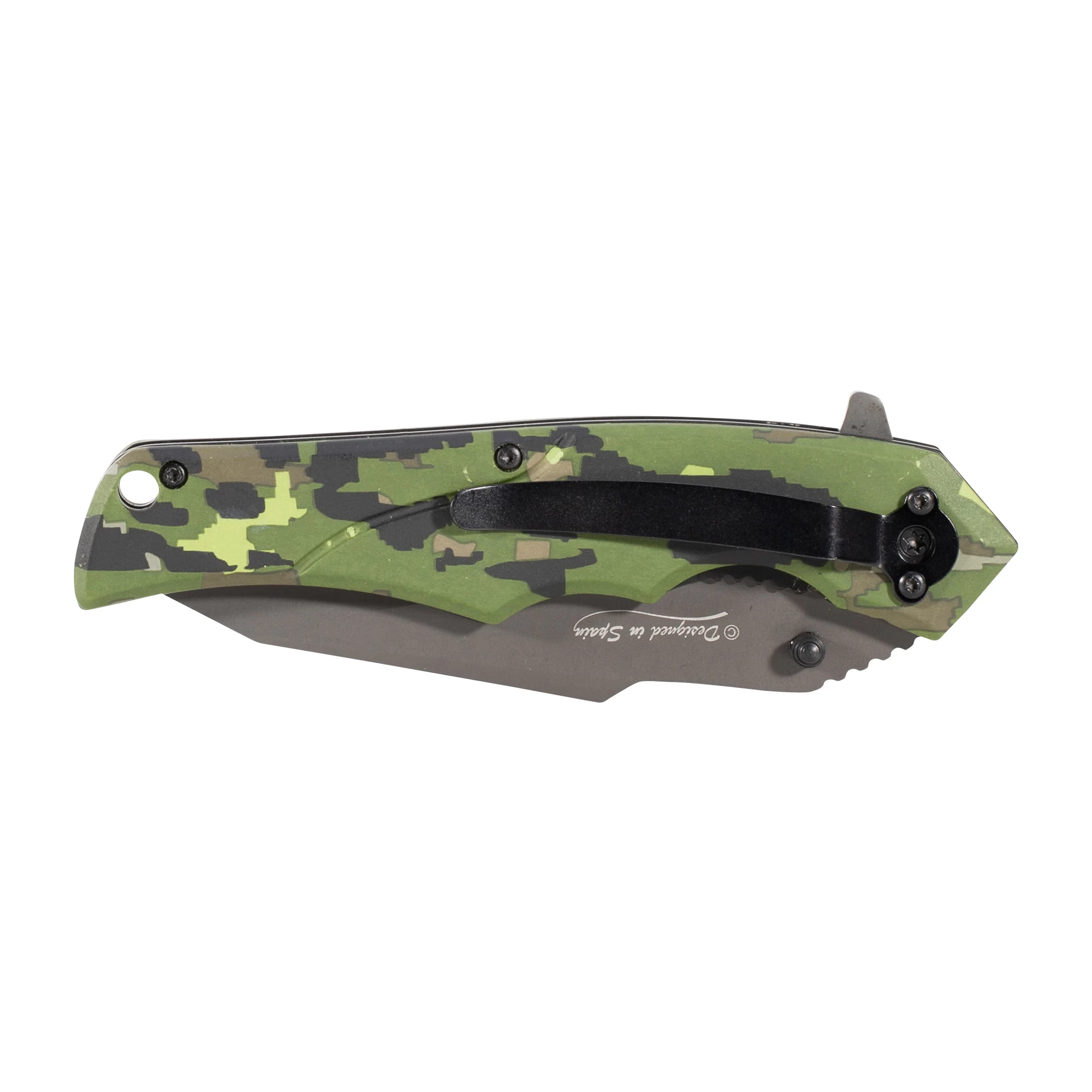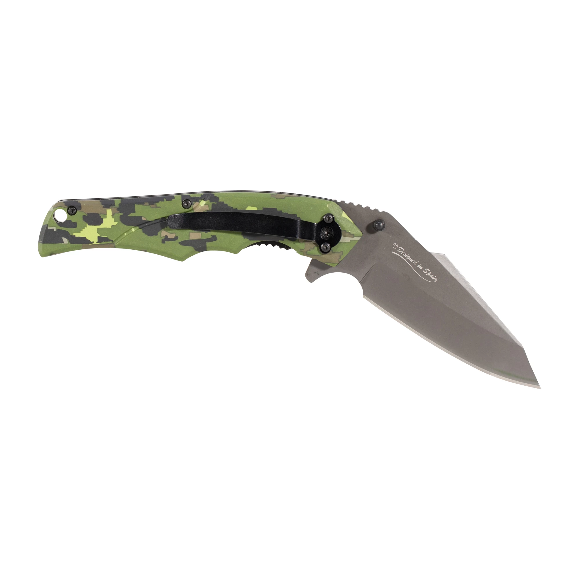 Praktisches Taschenmesser mit scharfer Klinge und ergonomischem Griff. Die Klinge wird aus robustem und schnitthaltigem Edelstahl gefertigt. Der Griff besteht aus Aluminium in camo-Optik und hat am Griffende eine Trageöse. Im Lieferumfang ist eine Nylontasche enthalten.