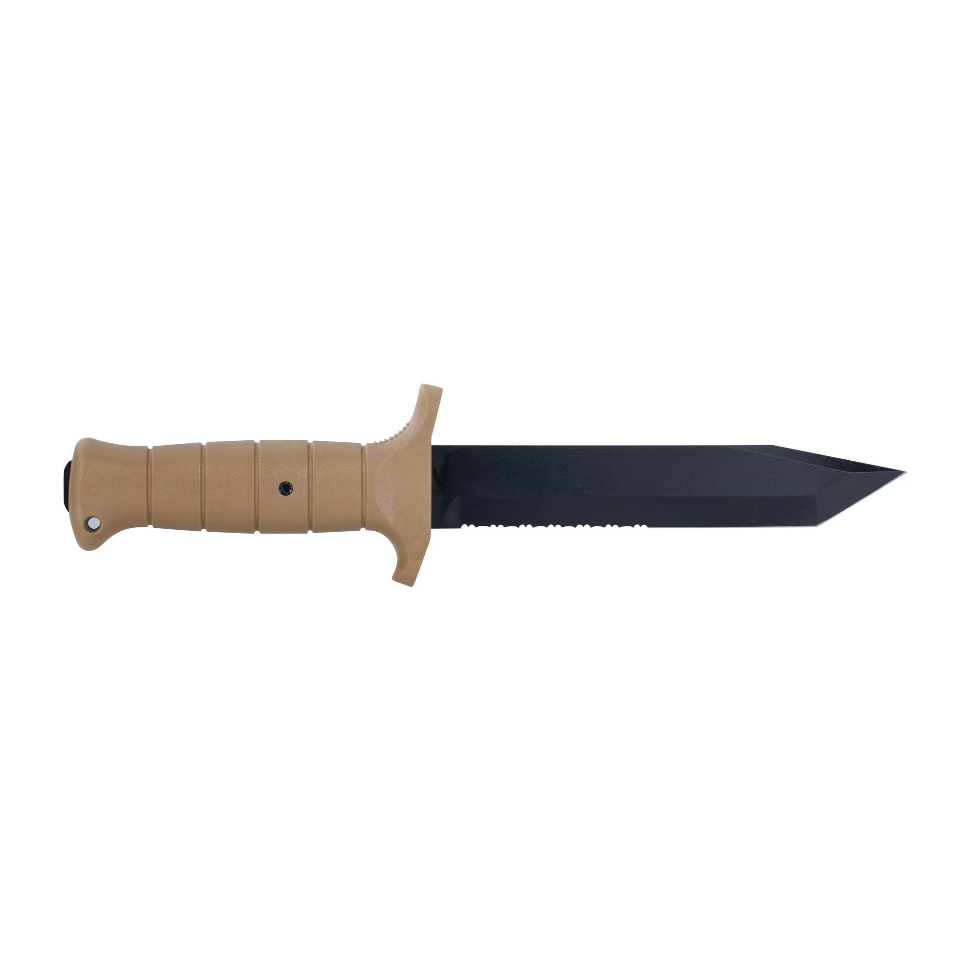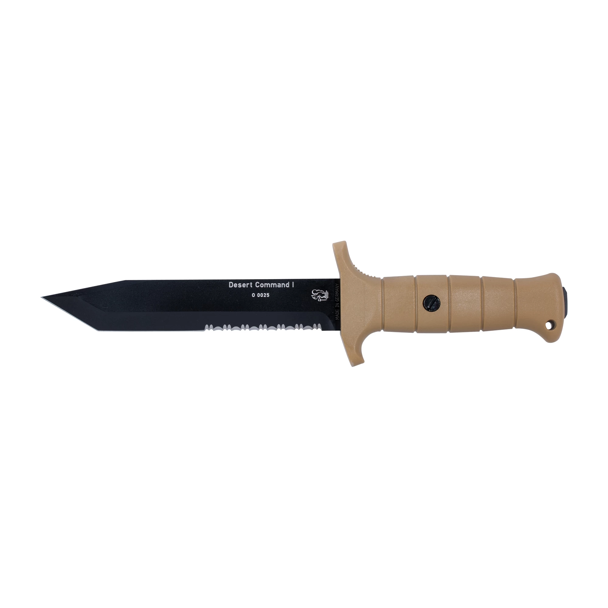 Das Kampfmesser der Bundeswehr mit Tantoklinge in coyote-farbiger Ausführung für den Einsatz in wüstenähnlichen Gebieten. Zum Schutz vor Reflektionen bei gleichzeitiger Erhöhung der Korrsosionsfestigkeit ist die gesamte Klinge mit einem mattschwarzen Kalgard Überzug versehen. Der ergonomisch geformte Griff aus glasfaserverstärktem Polyamid hat eine Parierstange mit Daumenauflage und eine Öse für Fangriemen. Das am Griffende herausschauende Klingenende kann sowohl zur Verteidigung als auch zum Einschlagen von Scheiben oder Nägeln verwendet werden. Die coyote-farbene Kunststoff-Nylon Spezialscheide mit Gurtband passt für alle MOLLE/IDZ Tragesysteme und lässt sich um 180 ° drehen. Auf der Rückseite der Scheide befindet sich eine Diamant-Nachschärfplatte.