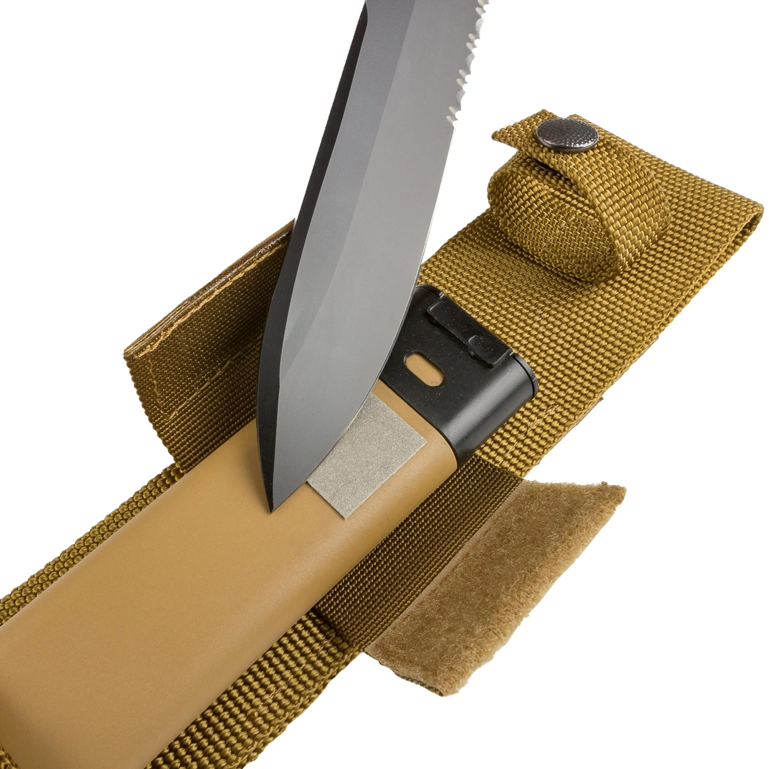 Das Kampfmesser der Bundeswehr mit Spearpointklinge, die im hinteren Bereich einen Wellenschliff aufweist. Die coyote-farbige Ausführung ist für den Einsatz in wüstenähnlichen Gebieten bestens geeignet. Zum Schutz vor Reflektionen bei gleichzeitiger Erhöhung der Korrsosionsfestigkeit ist die gesamte Klinge mit einem mattschwarzen Kalgard Überzug versehen. Der ergonomisch geformte Griff aus glasfaserverstärktem Polyamid hat eine Parierstange mit Daumenauflage und eine Öse für Fangriemen. Das am Griffende herausschauende Klingenende kann sowohl zur Verteidigung als auch zum Einschlagen von Scheiben oder Nägeln verwendet werden. Die coyote-farbene Kunststoff-Nylon Spezialscheide mit Gurtband passt für alle MOLLE/IDZ Tragesysteme und lässt sich um 180° drehen. Auf der Rückseite der Scheide befindet sich eine Diamant-Nachschärfplatte.