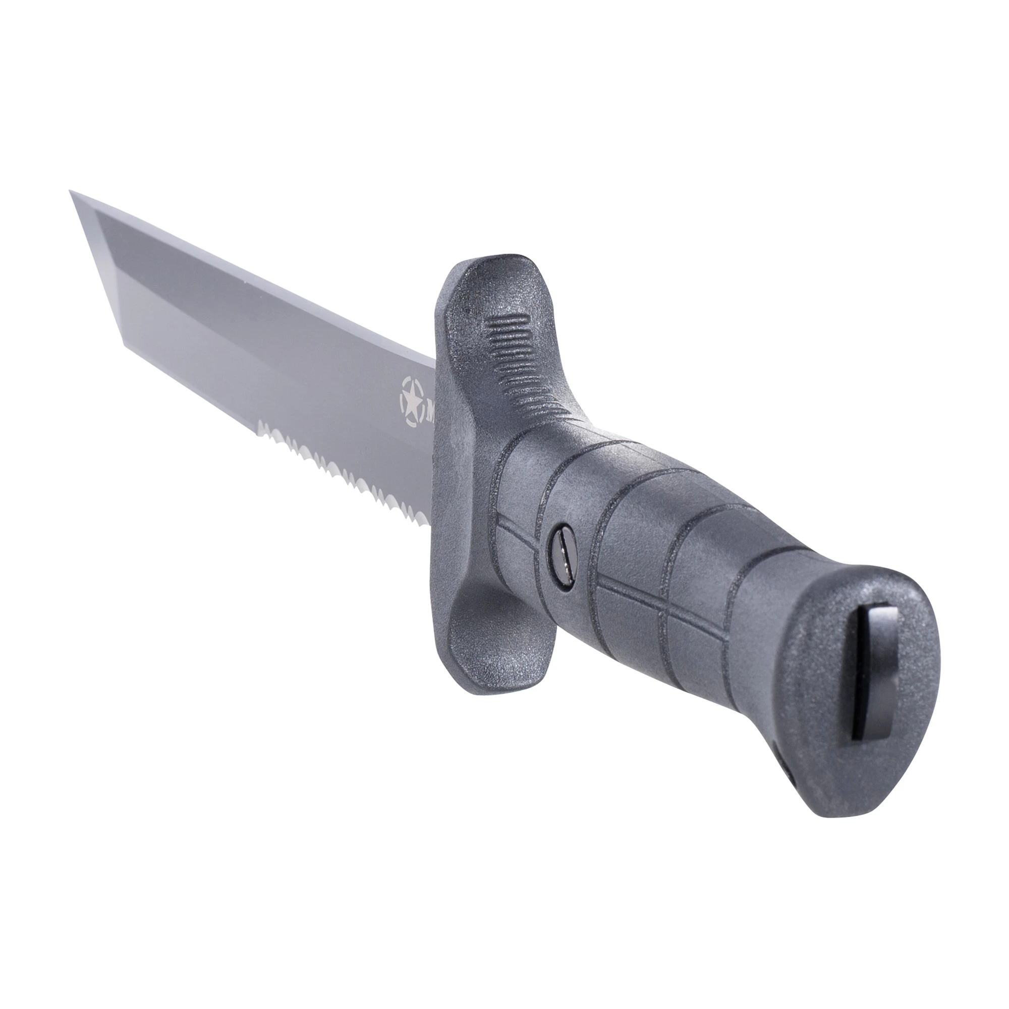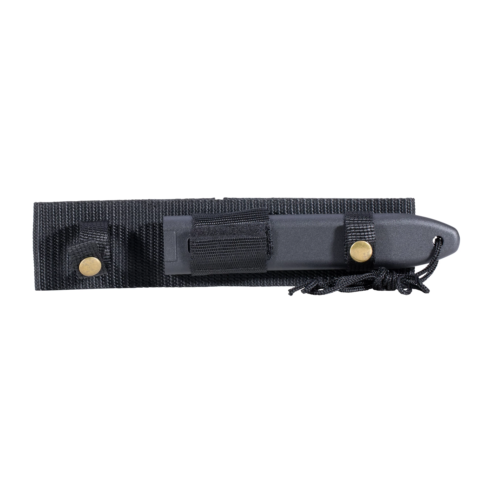 Lieferung erfolgt inklusive einer Kunststoffscheide mit einem integrierten Schleifeinsatz und einer MOLLE-Halterung aus Nylon.