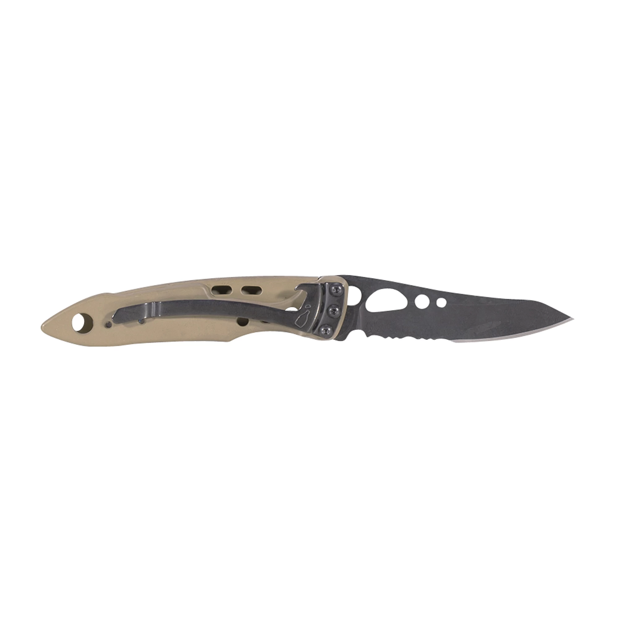 Das Leatherman Multitool Skeletool KBX coyote tan mit robuster Kombiklinge lässt sich für die unterschiedlichsten Aufgaben einsetzen. Egal ob beim Arbeiten oder im Alltag, die Klinge mit Teilwellenschliff macht einiges mit. An der Rückseite des Skeletools befindet sich ein Kapselheber direkt am Clip. So haben Sie Messer und Flaschenöffner gleichzeitig dabei.