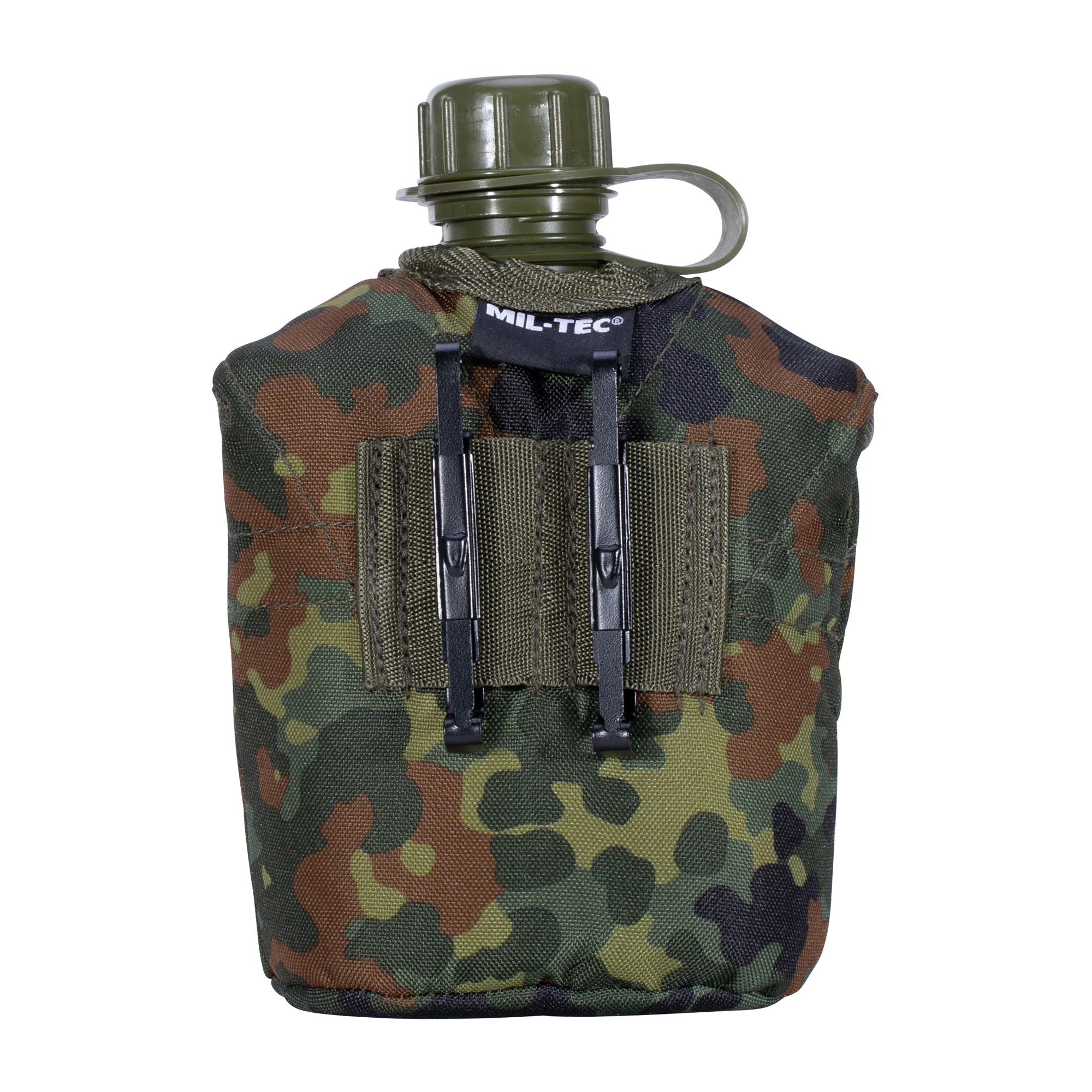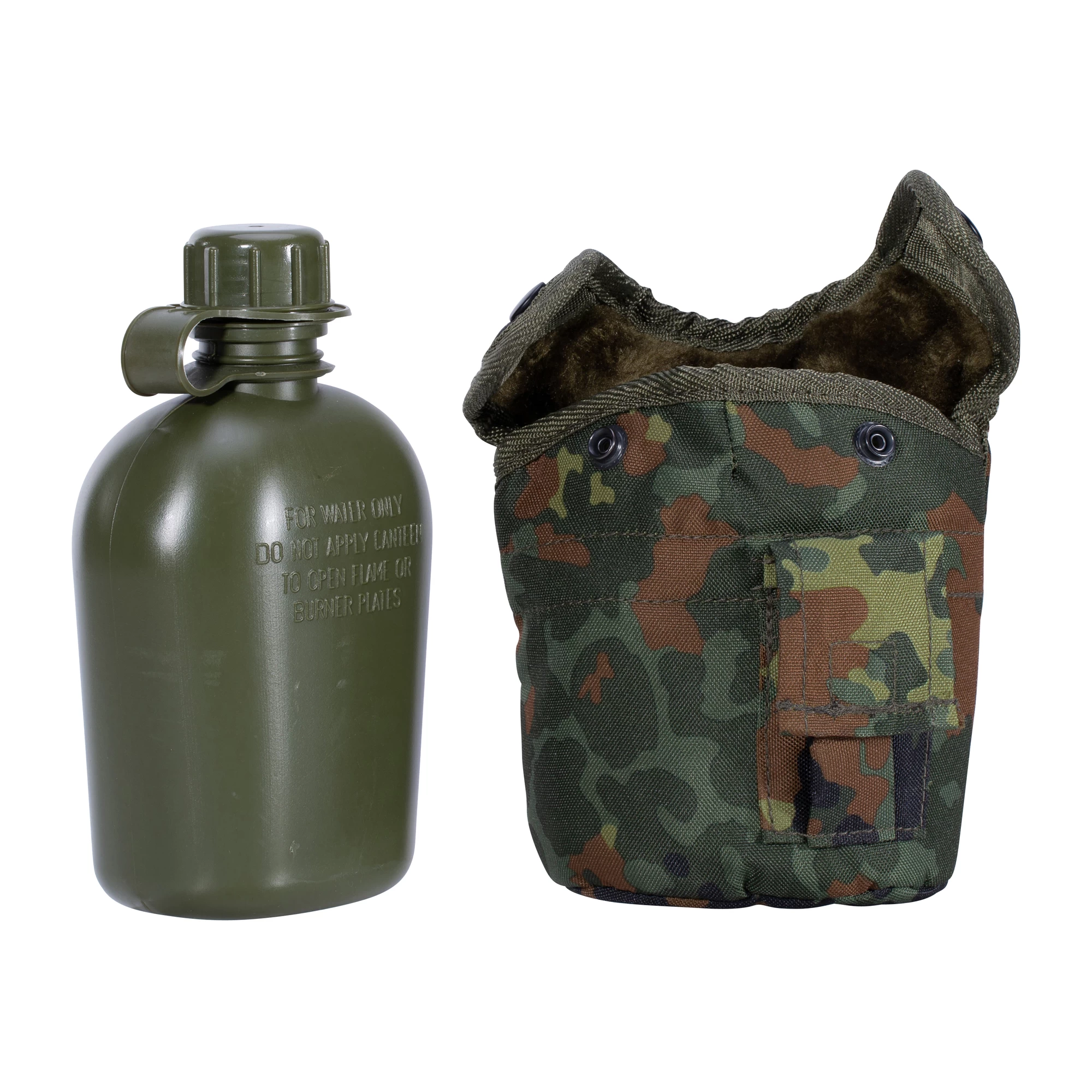 Kunststoff-Feldflasche mit Schraubverschluss. Lieferung inklusive Feldflaschenhülle mit isolierendem Plüschfutter und Aluminiumbecher mit klappbaren Bügelgriffen.