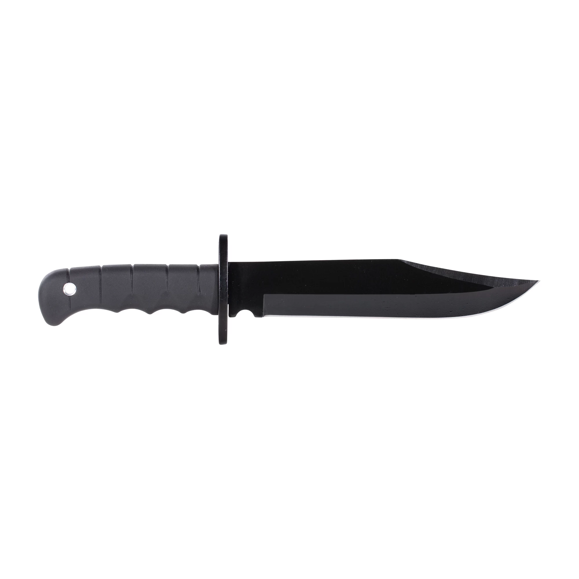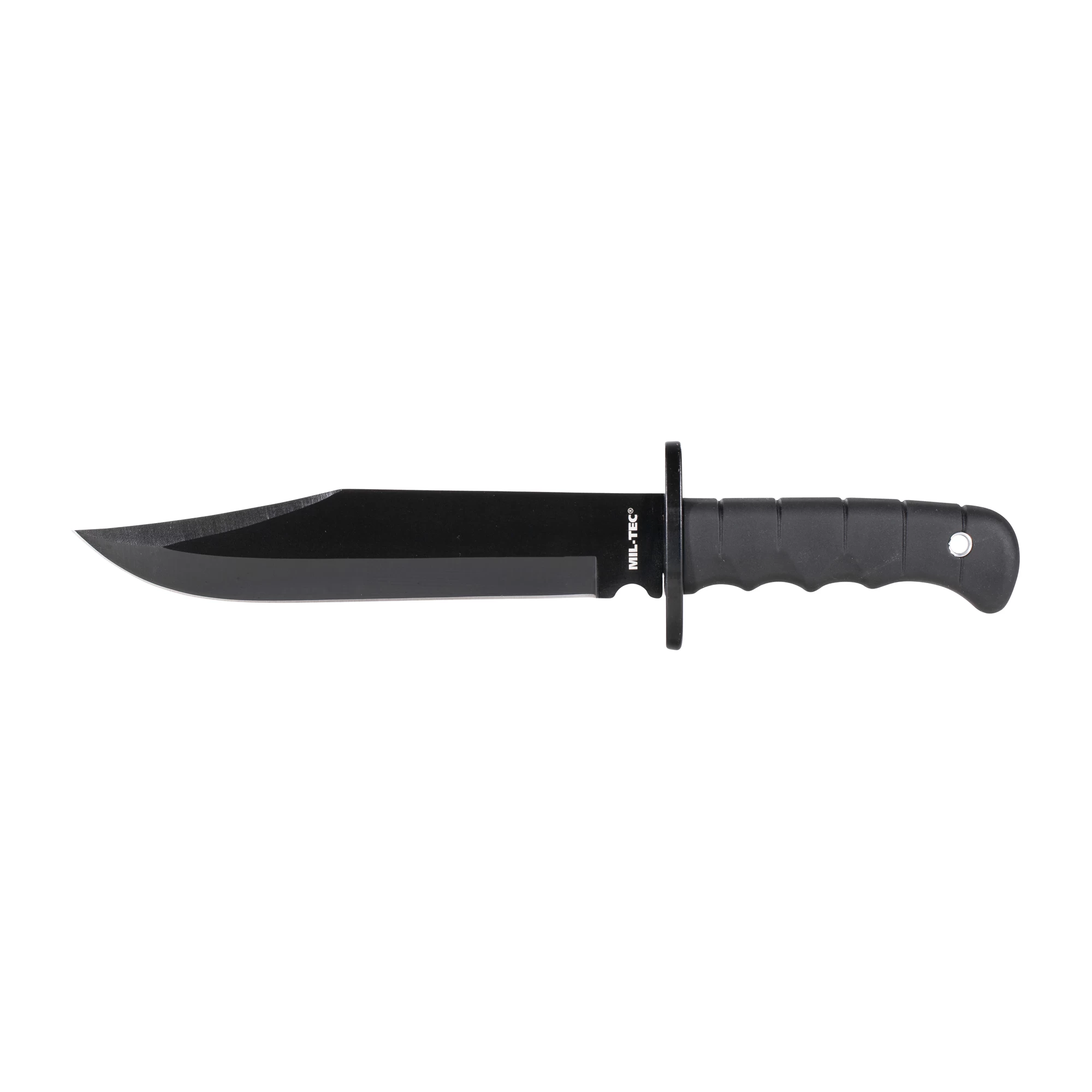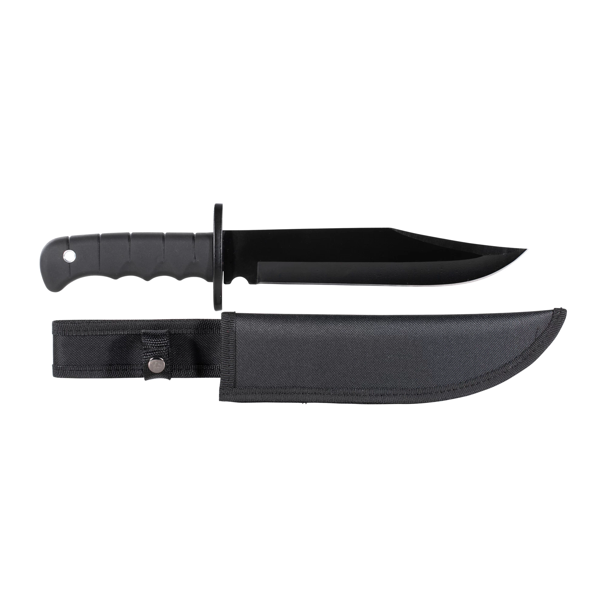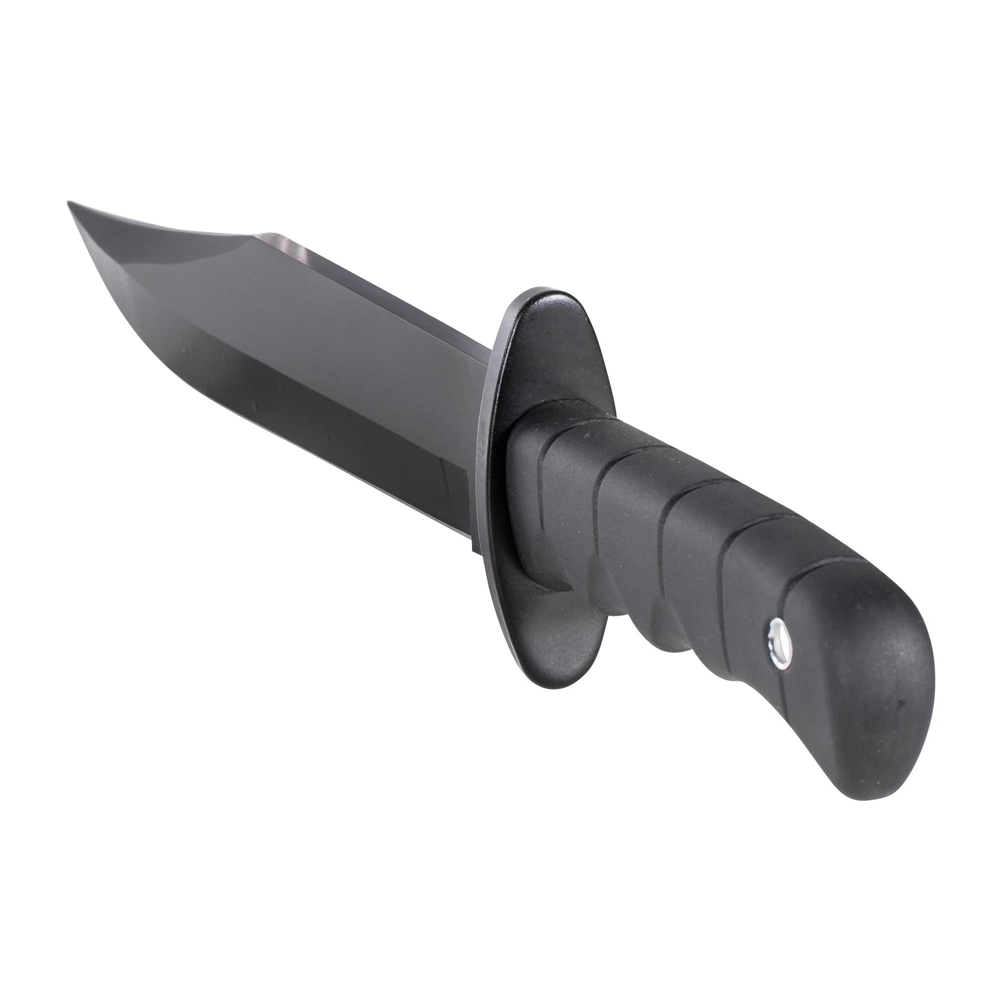 Ein preiswertes Messer, das perfekt in der Hand liegt und mit dem sich daher optimal arbeiten läßt. Das Kampfmesser hat einen Fingermuldengriff aus Aluminium mit einer speziellen glatten Oberfläche und einer Öse für einen Fangriemen. Die Parierstange schützt die Hand zuverlässig vor Verletzungen. Die typische Bowieklinge weist eine schwarze Beschichtung auf und hat eine Stärke von 4,5 mm. Inklusive Gürtelscheide aus Nylon.