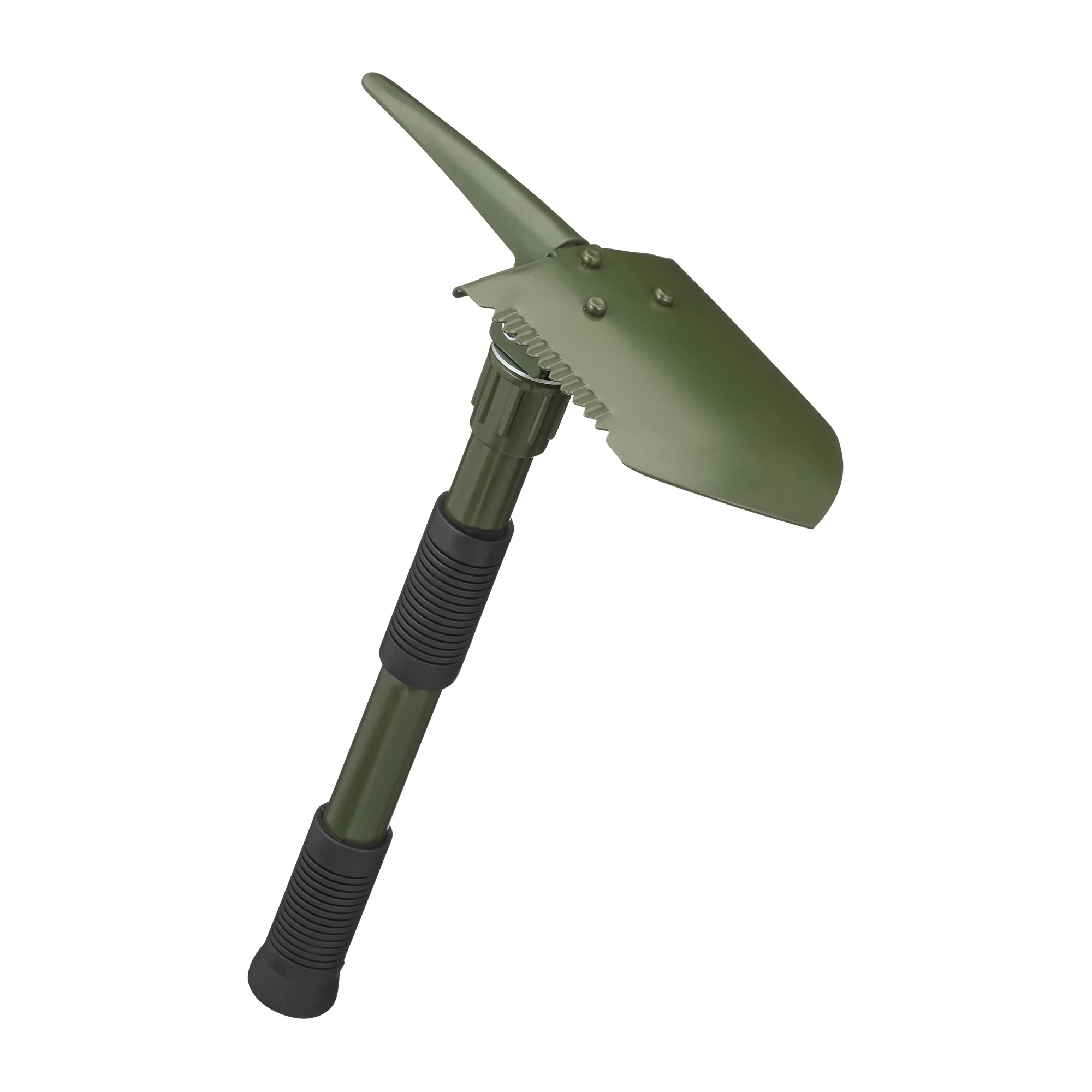 Praktischer Outdoor-Spaten mit Hacke und einem Spatenblatt mit Sägezahnung auf einer Seite.