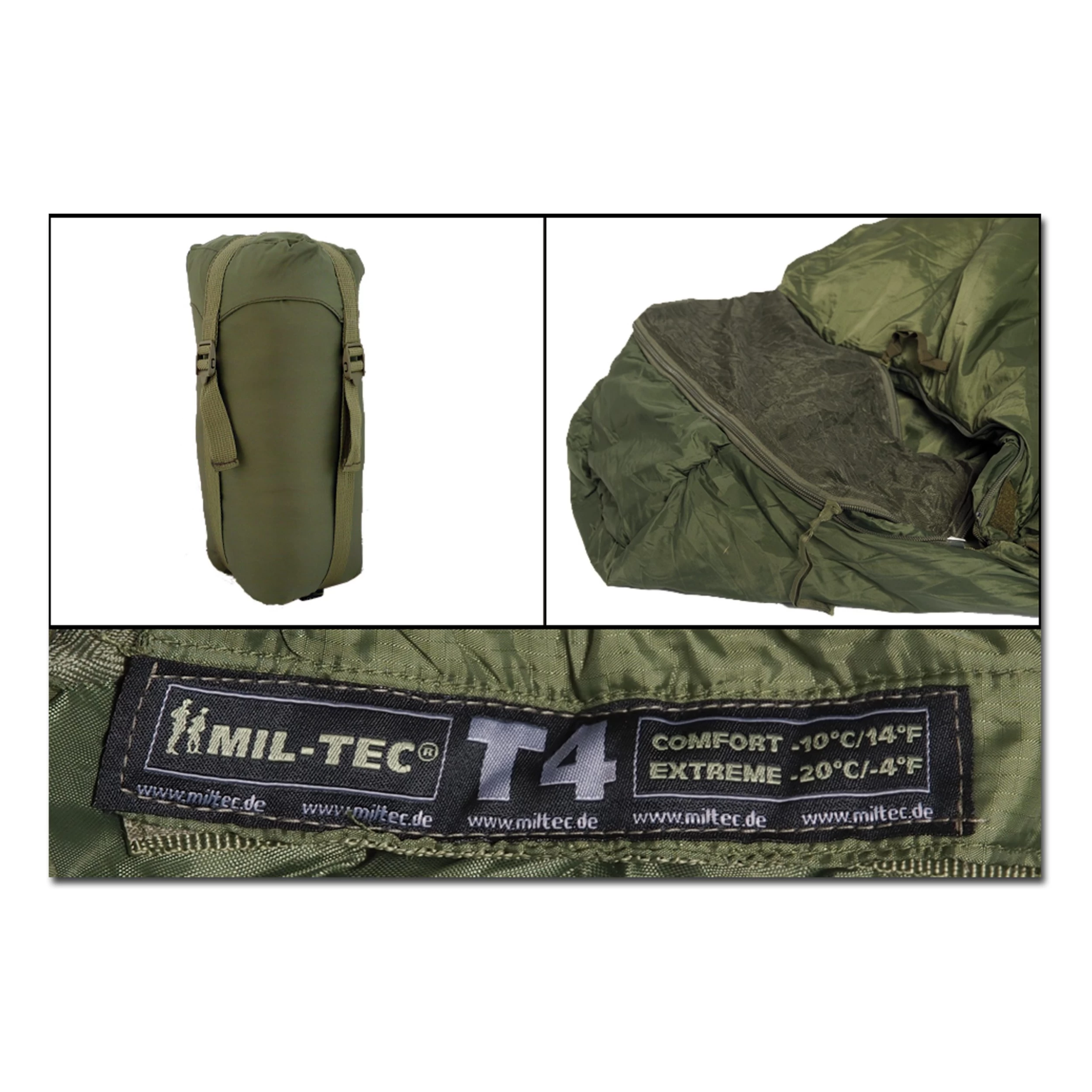 Der Schlafsack Tactical 4 ist ein robuster Outdoorschlafsack mit geringem Gewicht und Packmaß. Die Isolierung aus Thermolite High-Tech Material hält die Wärme zuverlässig im Schlafsackinneren. Für den einfachen und schnellen Einstieg sorgt ein seitlicher 2-Wege-Reißverschluss mit Klettverschluss. Die Integralkapuze verfügt über einen Wärmekragen und kann mit einem Schnürzug an den Nutzer angepasst werden. In einer Innentasche befindet sich ein Moskitonetz, das in wenigen Augenblicken im Sichtbereich befestigt werden kann. Die komplette Unterseite ist mit einer Teflonbeschichtung versehen, die Flüssigkeiten auf Wasser- und Ölbasis einfach ablaufen lässt. Im Lieferumfang ist ein Kompressionssack enthalten.
