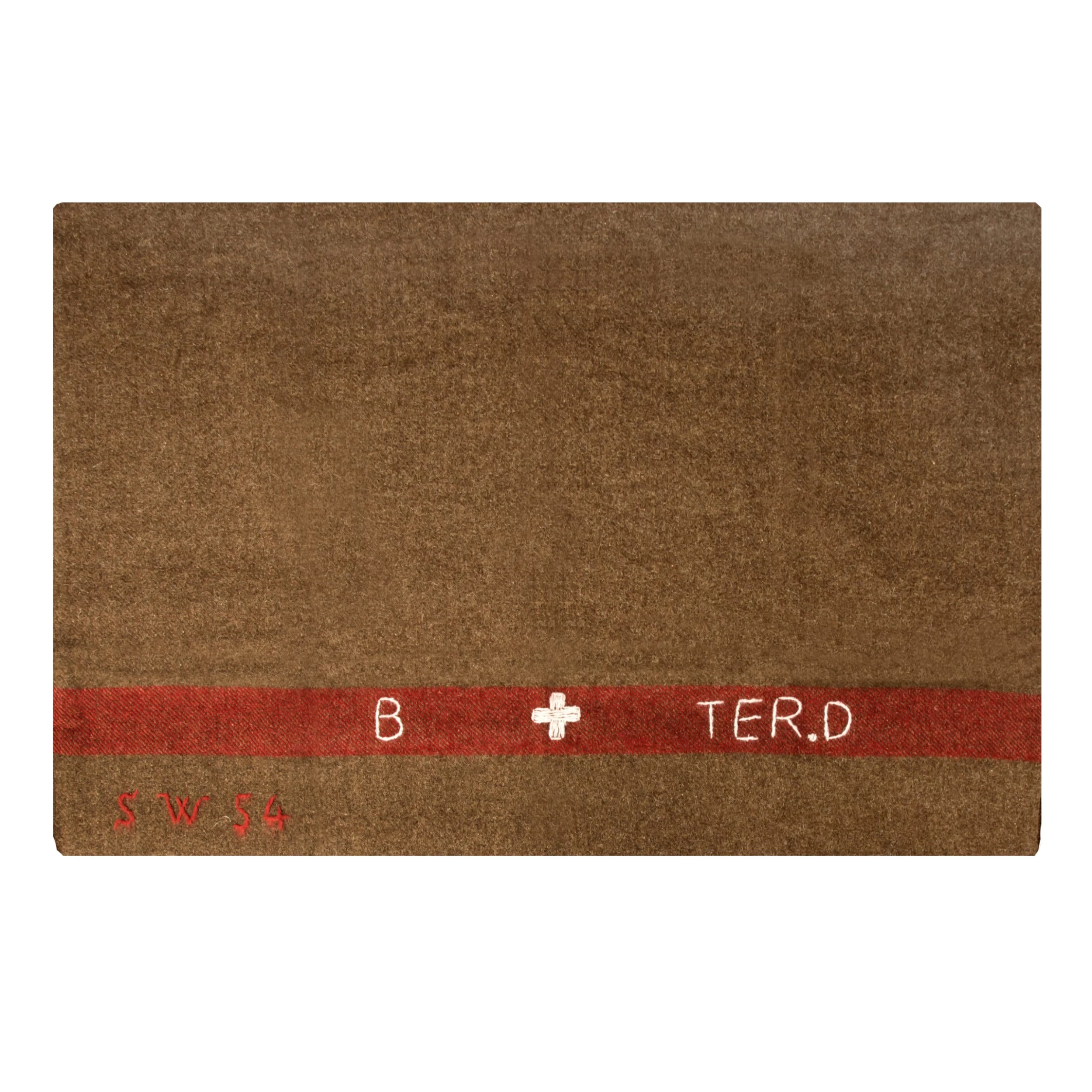 Reproduktion der original Schweizer Armeedecke. Sie besitzt an beiden Enden je einen roten Streifen mit einem weißen Kreuz in der Mitte.