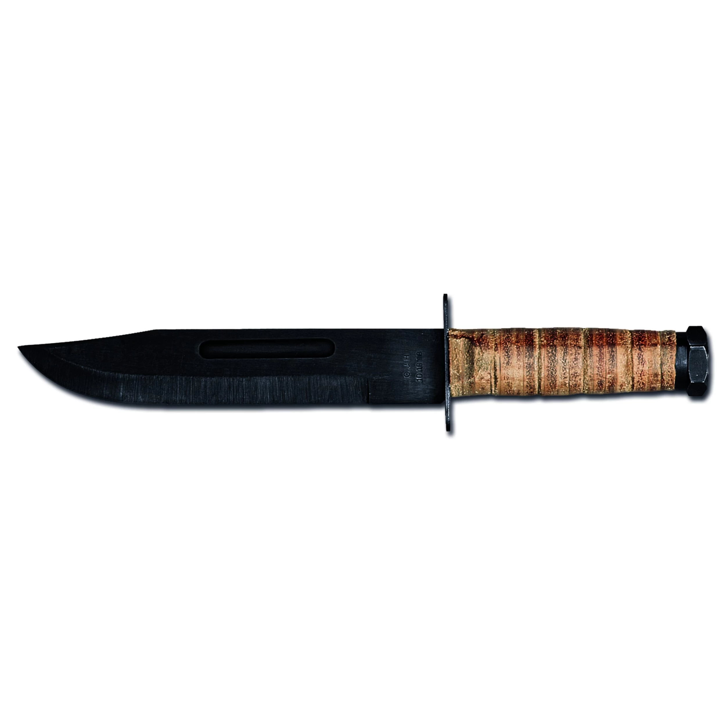 Wuchtiges Herbertz Bowie-Messer mit einer 18 cm langen, brünierten Klinge. Der Griff ist aus festem Leder gefertigt. Zur Klinge hin schliesst sich ein Parierelement zum Schutz der Hand an. Das Messer wird in einer Lederscheide geliefert, in deren Vortasche sich ein Abziehstein befindet.