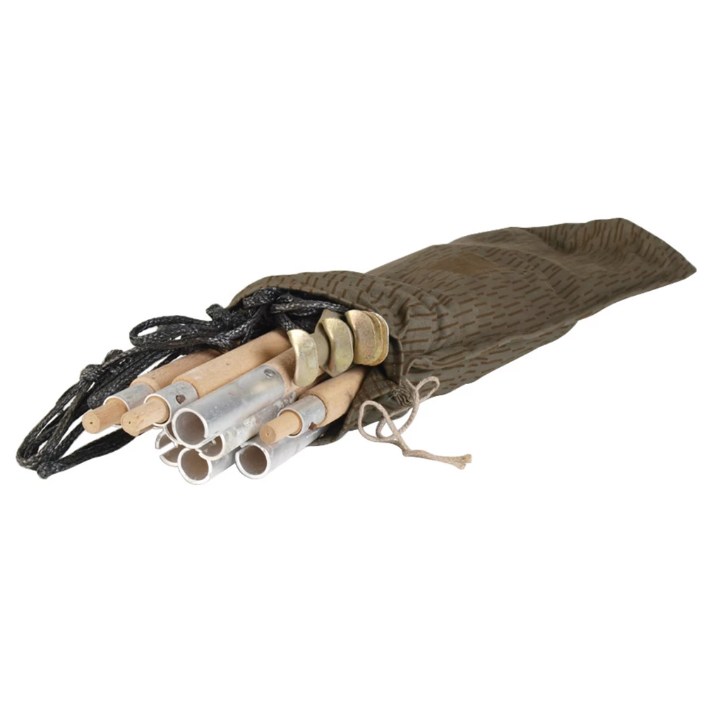 Das Zeltbesteck kommt im praktischen und platzsparenden Beutel. Zusammen mit der passenden NVA Zeltbahn lässt sich leicht ein Zelt aufbauen.