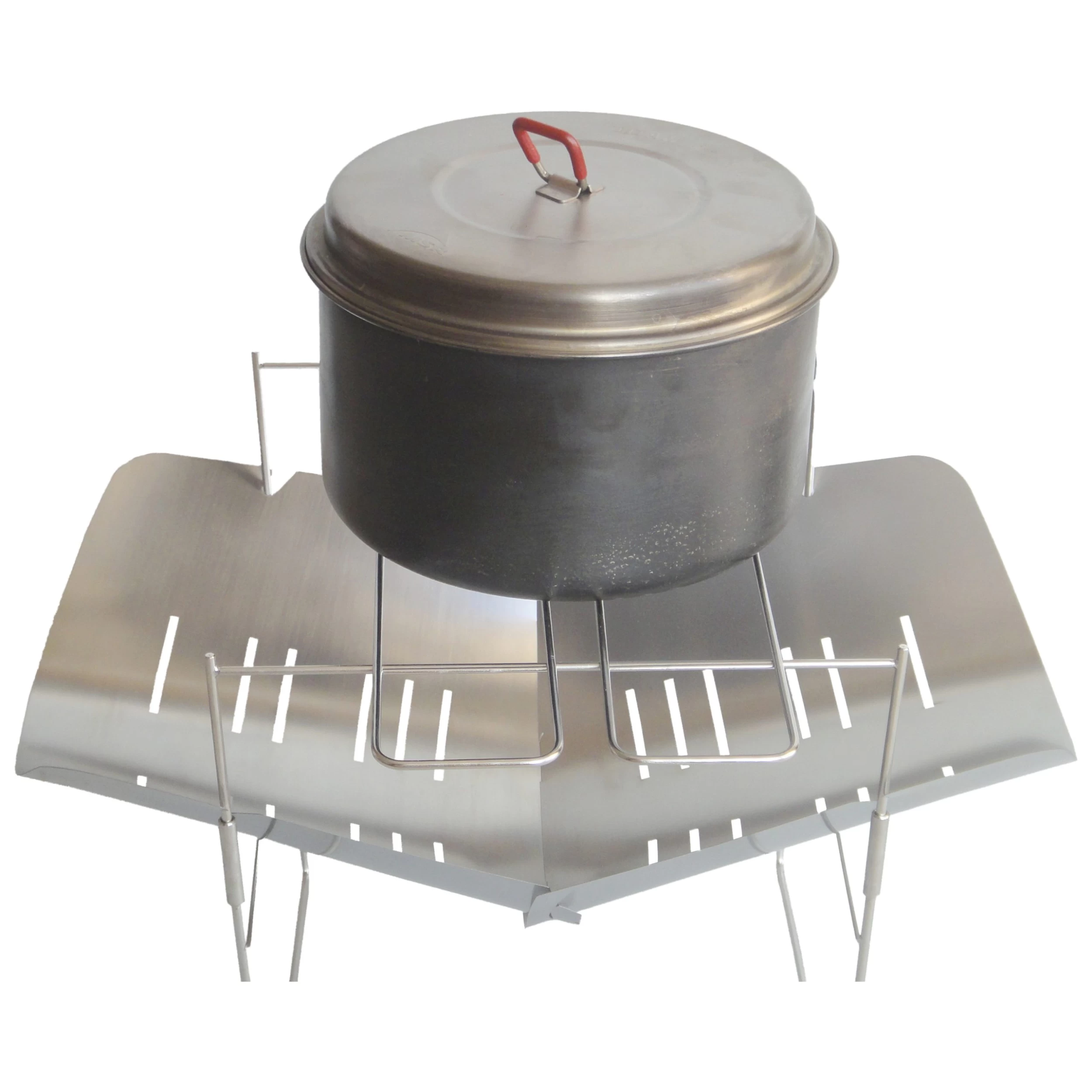 Das Feuer brennt in einer Schale direkt über dem Boden (dieser kann mit Alufolie und dem Wärmeblech geschützt werden) und kann daher unabhängig von der Bodenbeschaffenheit genutzt werden. Die Brennschale besteht aus 2 Teilen, das Gestell aus 8, welche blitzschnell aufgebaut werden können. Mit den beiden mitgelieferten Spießen können Sie Ihr Grillgut direkt über dem Feuer zubereiten, ein Rost wird nicht benötigt. Ermöglicht das einfache Wenden, da der Griff kaum heiß wird. Außerdem kann auch mit einer Pfanne bis ca. 2,5 Litern gekocht werden.