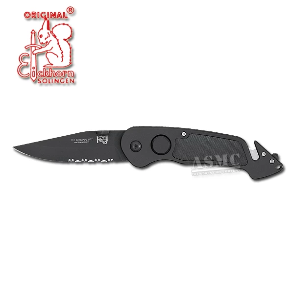 Das Taschenrettungsmesser PRT-VI Tactical (Pocket Rescue Tool) ist ein kleines und leichtes Rettungswerkzeug mit einer Bowieklinge, die mit einer schwarzer Kalgard-Beschichtung versehen ist und einen partiellen Wellenschliff aufweist. Es lässt sich mit einer Hand öffnen und hat eine Liner-Lock Verriegelung mit Sicherheitsstop. Die Entriegelung erfolgt durch den Druckknopf im Griff. Der schwarz eloxierte Aluminiumgriff liegt mit seinen Gummieinlagen sicher in der Hand. Weitere Features: Integrierter Gurtschneider und Glasbrecher, Gürtelclip, Fangriemenöse.