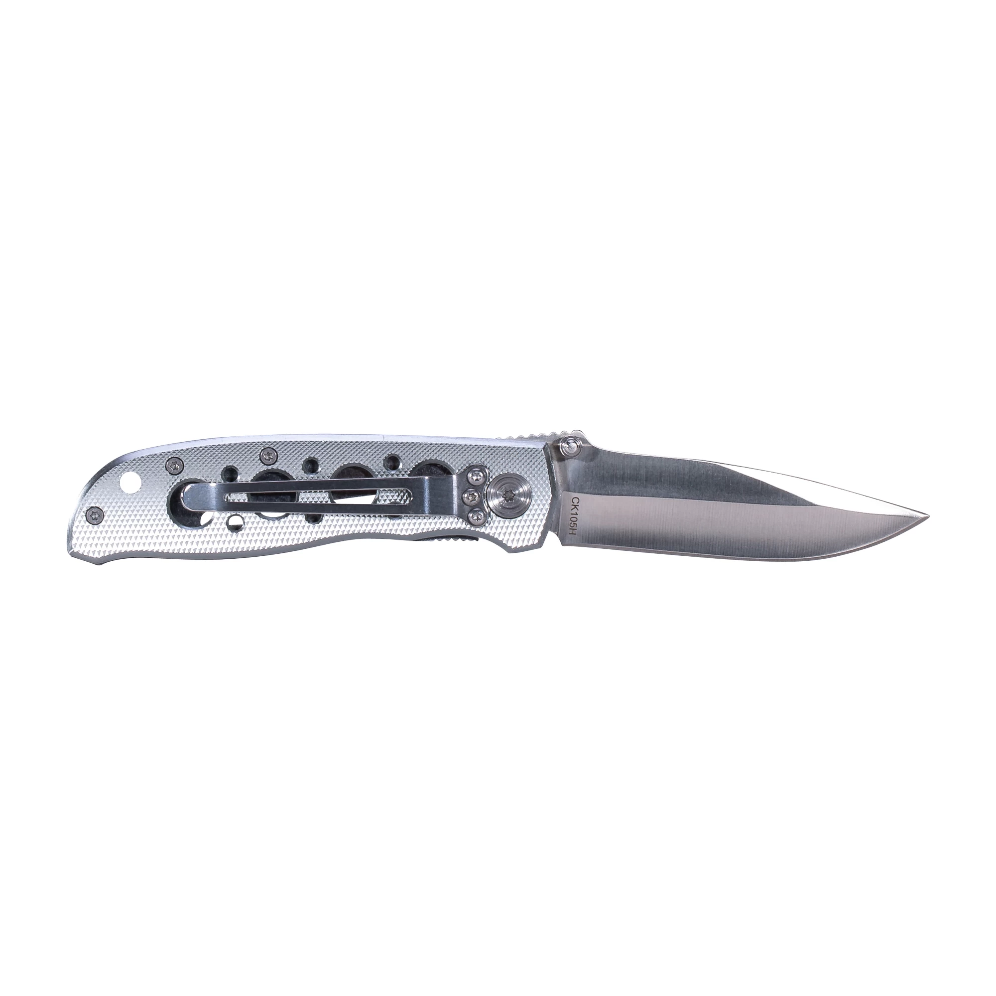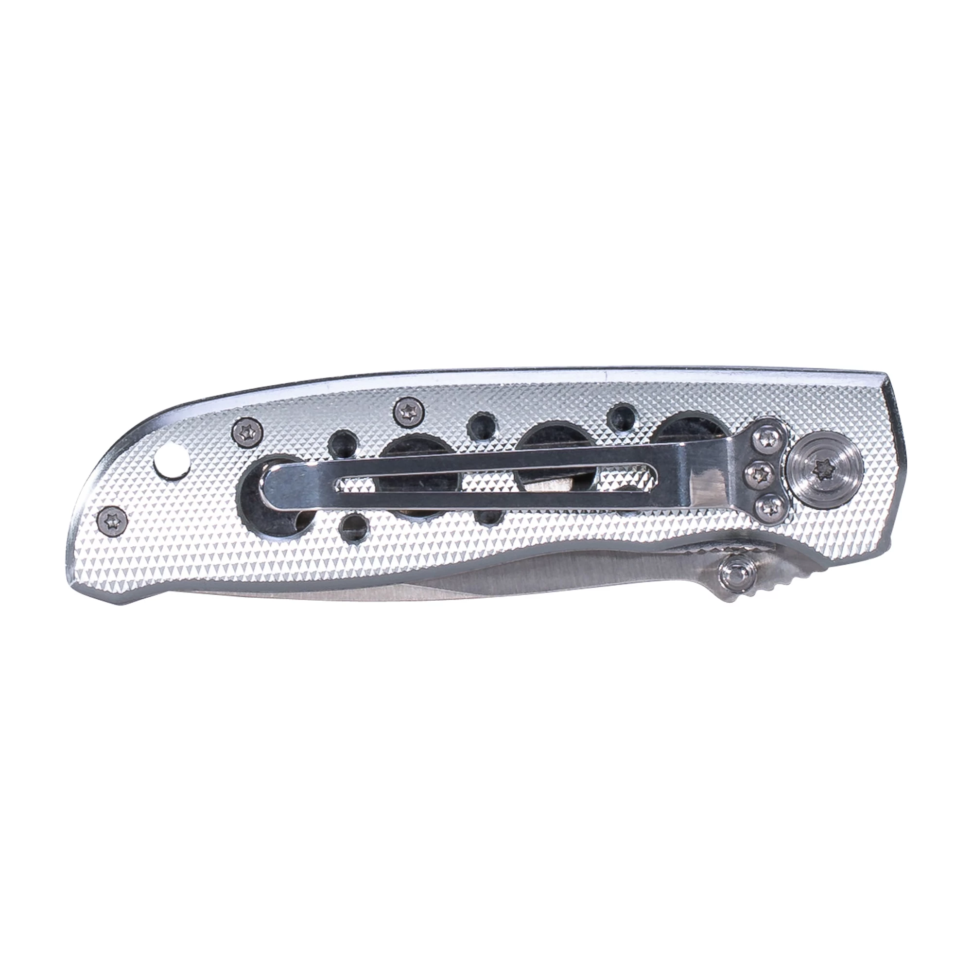 Wenn man das Extreme Ops in die Hand nimmt, findet der Daumen fast automatisch seinen Platz auf der Daumenauflage. Zahlreiche Öffnungen im Aluminium-Heft reduzieren nicht nur das Gewicht, sondern geben auch einen interessanten Blick in das Innenleben des Einhandmessers frei. Als Klingenmaterial kommt rostfreier Stahl 440 A zum Einsatz. Die Arretierung der Klinge erfolgt über einen Liner Lock. Mit dem Edelstahl-Clip lässt sich das Smith & Wesson-Messer problemlos befestigen.