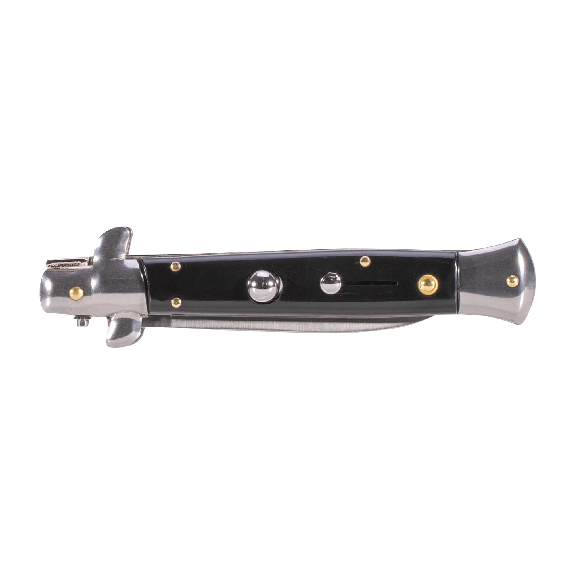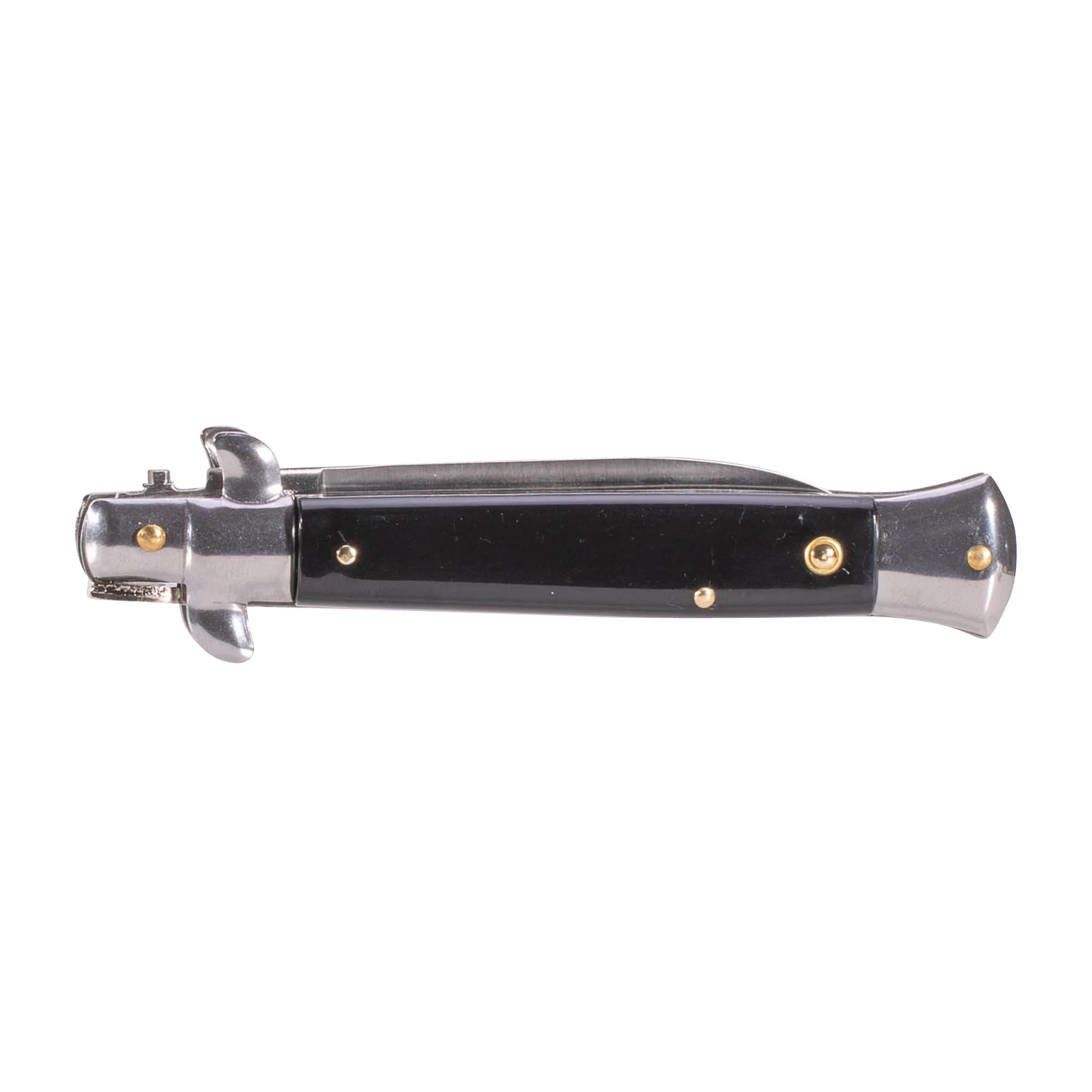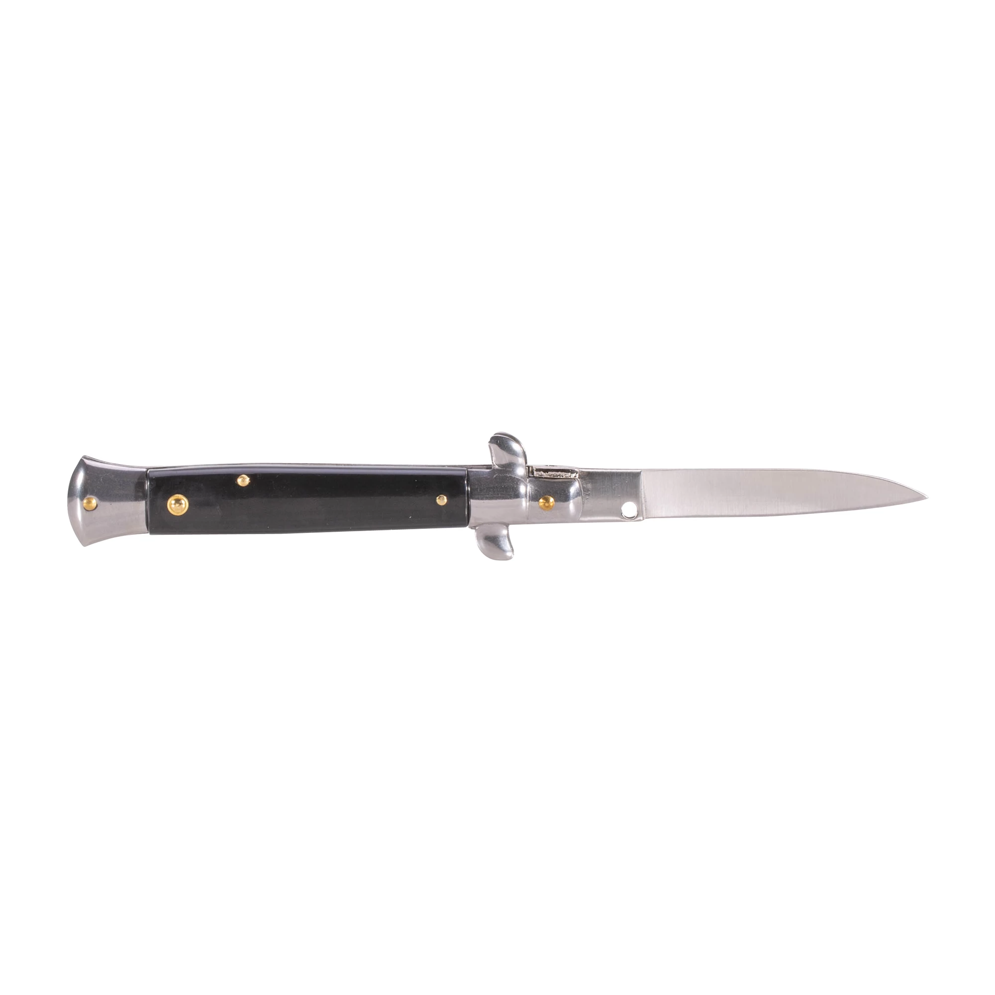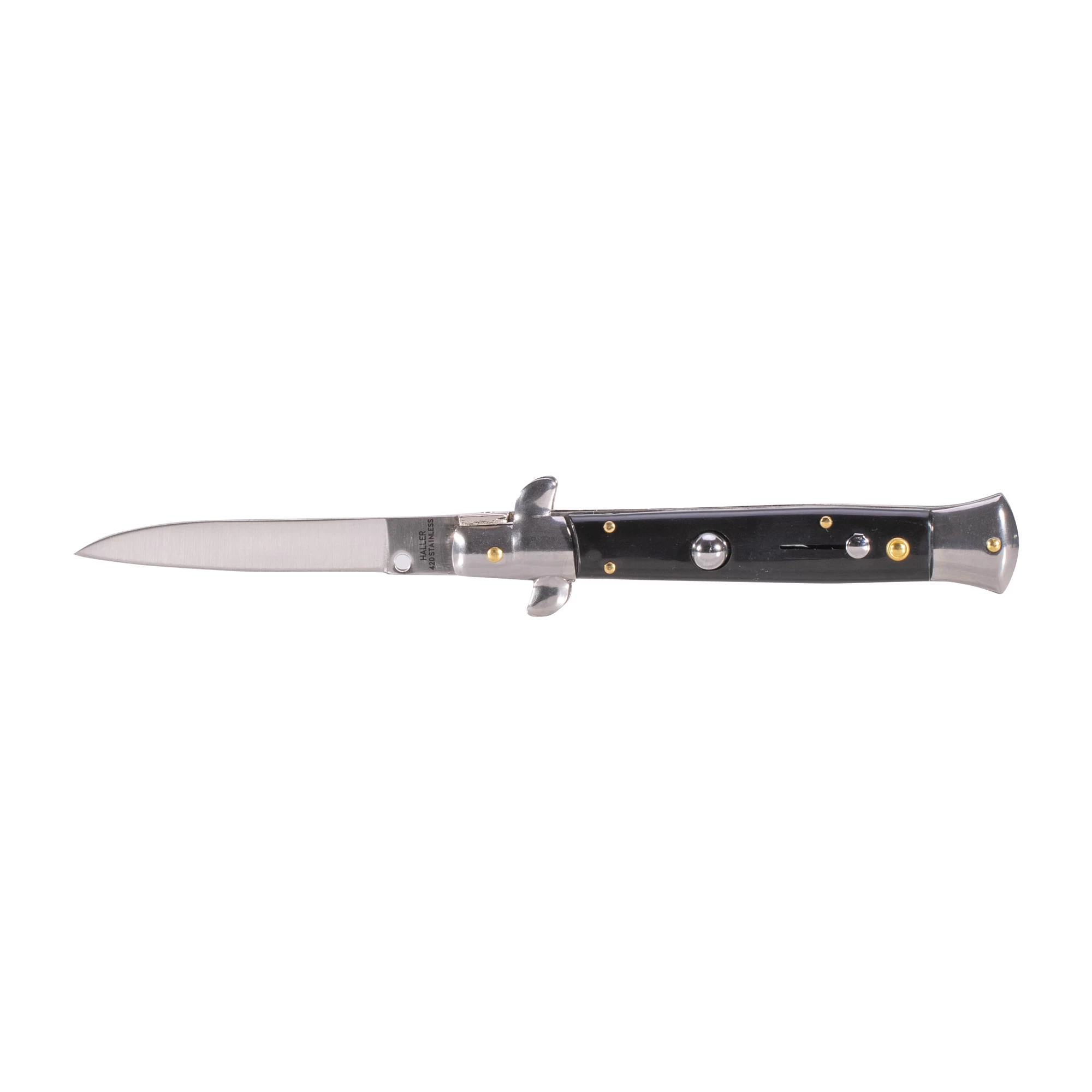 Das Springmesser Haller Stiletto besitzt eine Sicherung im Griff, die ein unbeabsichtigtes Aufspringen der Klinge verhindert. Die Griffbeschalung ist aus Kunststoff.