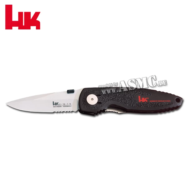 Seit mehr als vier Jahrzehnten zählt die Firma Heckler & Koch aus Oberndorf am Neckar zu den weltweit führenden Herstellern von Polizei- und Militärwaffen. Nahezu jede Eliteeinheit ist mit Waffen dieser Firma ausgestattet. In Ergänzung zum Schusswaffen-Programm wurde nun unter den gleichen Kriterien ein taktisches Einsatzmesser entwickelt, das Funktions- und Designelemente der HK Pistolen aufweist. Die Griffschalen werden aus dem gleichen glasfaserverstärktem Kunststoff gefertigt wie die Pistolengriffe und haben somit die gleiche rutschsichere Oberfläche. Das Messer kann zum reinigen komplett zerlegt werden. Der links-und rechtshändig montierbare Hosenclip ist aus Rundfederstahl. Der Klingenstahl X-15-T.N hat eine überdurchschnittliche Schnitthaltigkeit bei einer Rockwellhärte von 58 HRC und ist extrem rostbeständig.