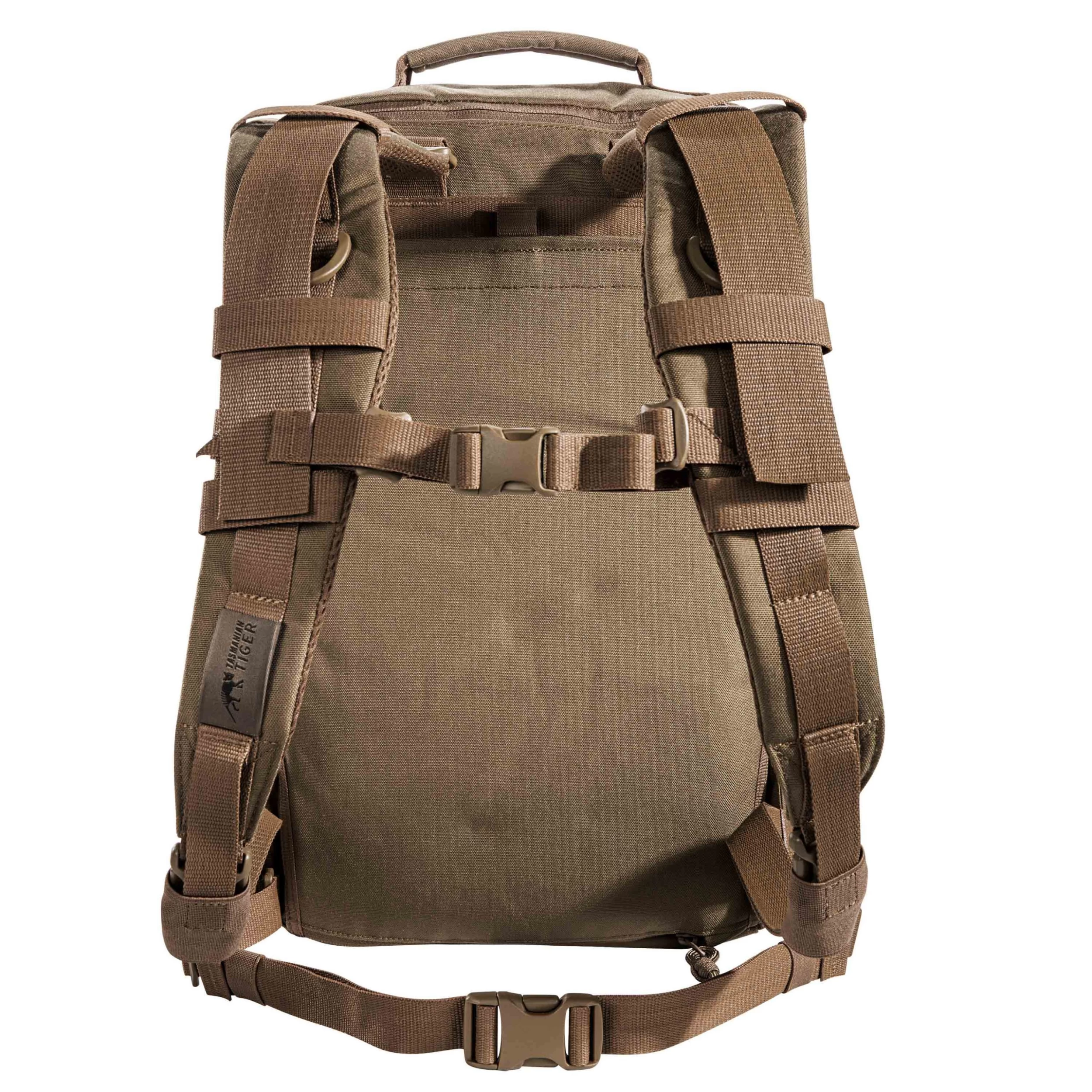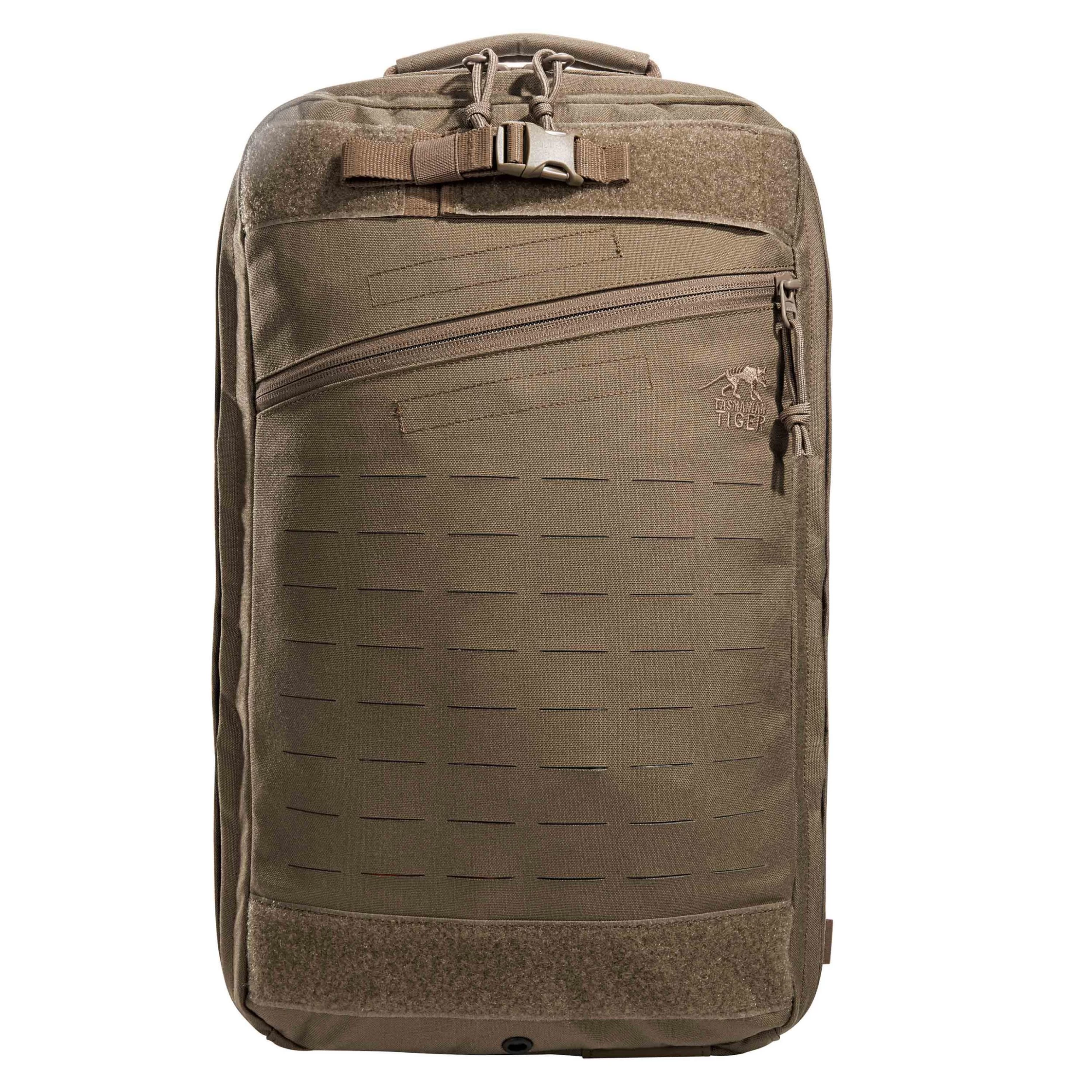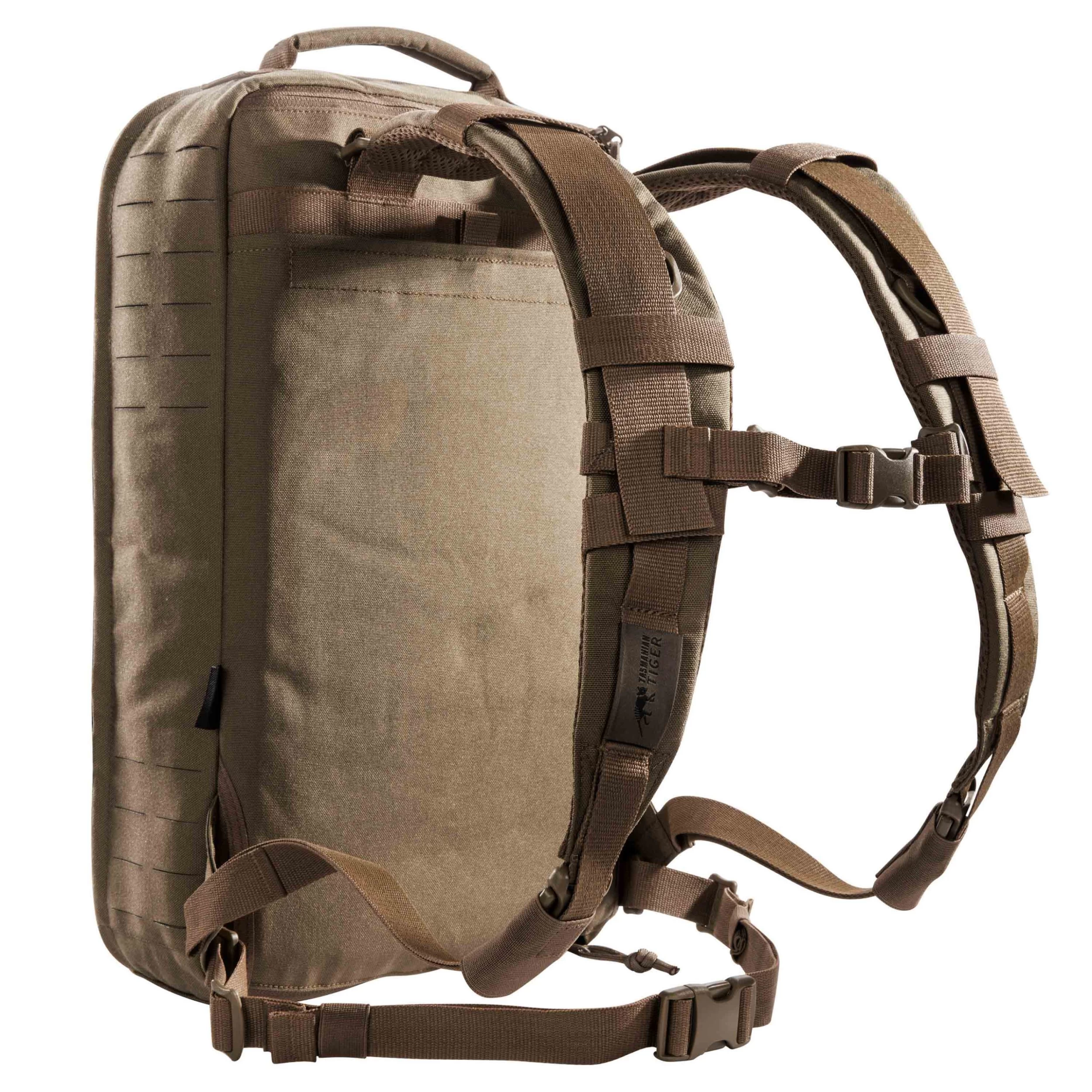 Der Medic Pack mit IRR-Material ist in der dritten Größe ca. 4 cm oder einen Molle-Streifen größer als die kleineren Modelle. Er lässt sich an den außen vorhandenen Laser Cut-Molle-Flächen beliebig erweitern, verfügt aber bereits über eine durchdachte Aufteilung im Hauptfach. Um die Innentaschen und das darin verstaute Material leicht unterscheiden zu können, sind die Klarsicht-Innentaschen mit verschiedenfarbigem Klett markiert. Das abnehmbare Schultertragesystem kann im Rücken verstaut und so der Rucksack auf Plattenträger oder Weste montiert werden. Das Gurtband hierzu wird mitgeliefert. Für Rettungsdecken befindet sich am Boden eine Fixiermöglichkeit, sodass Sie auch im Notfall schnell darauf zugreifen können.