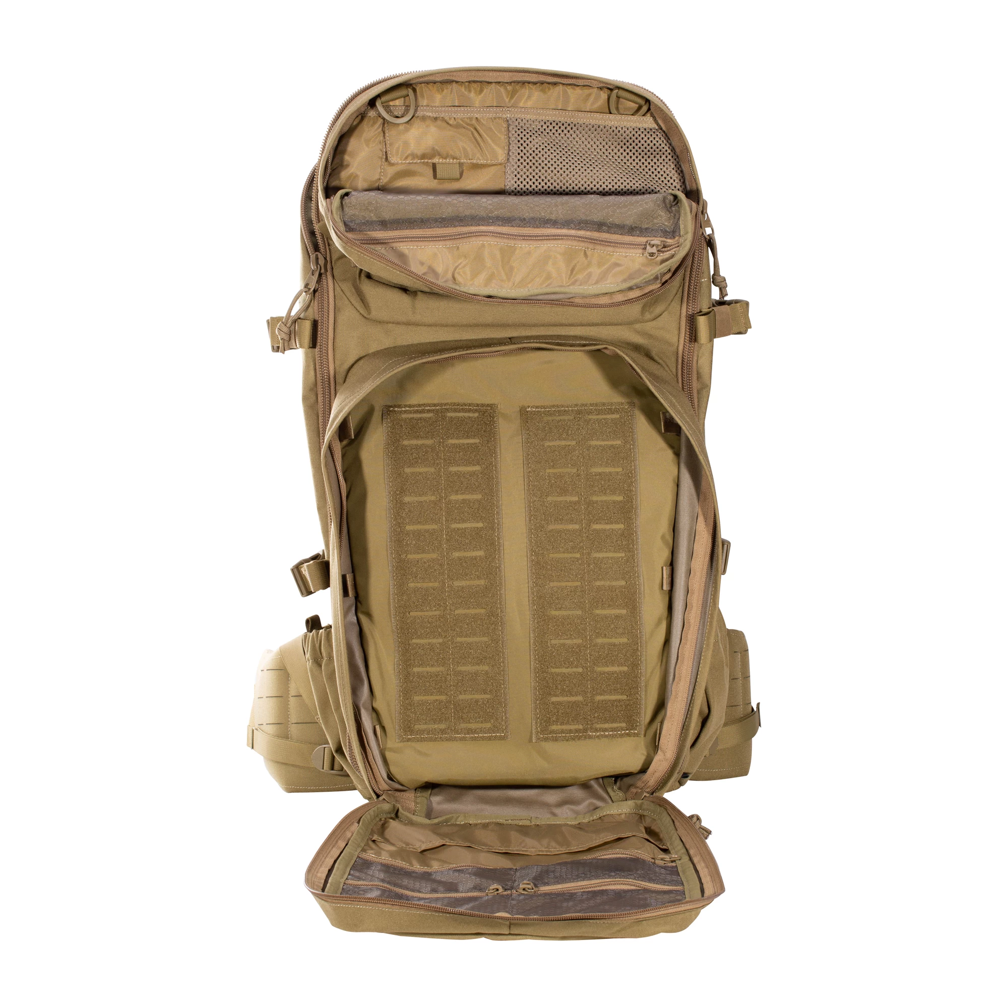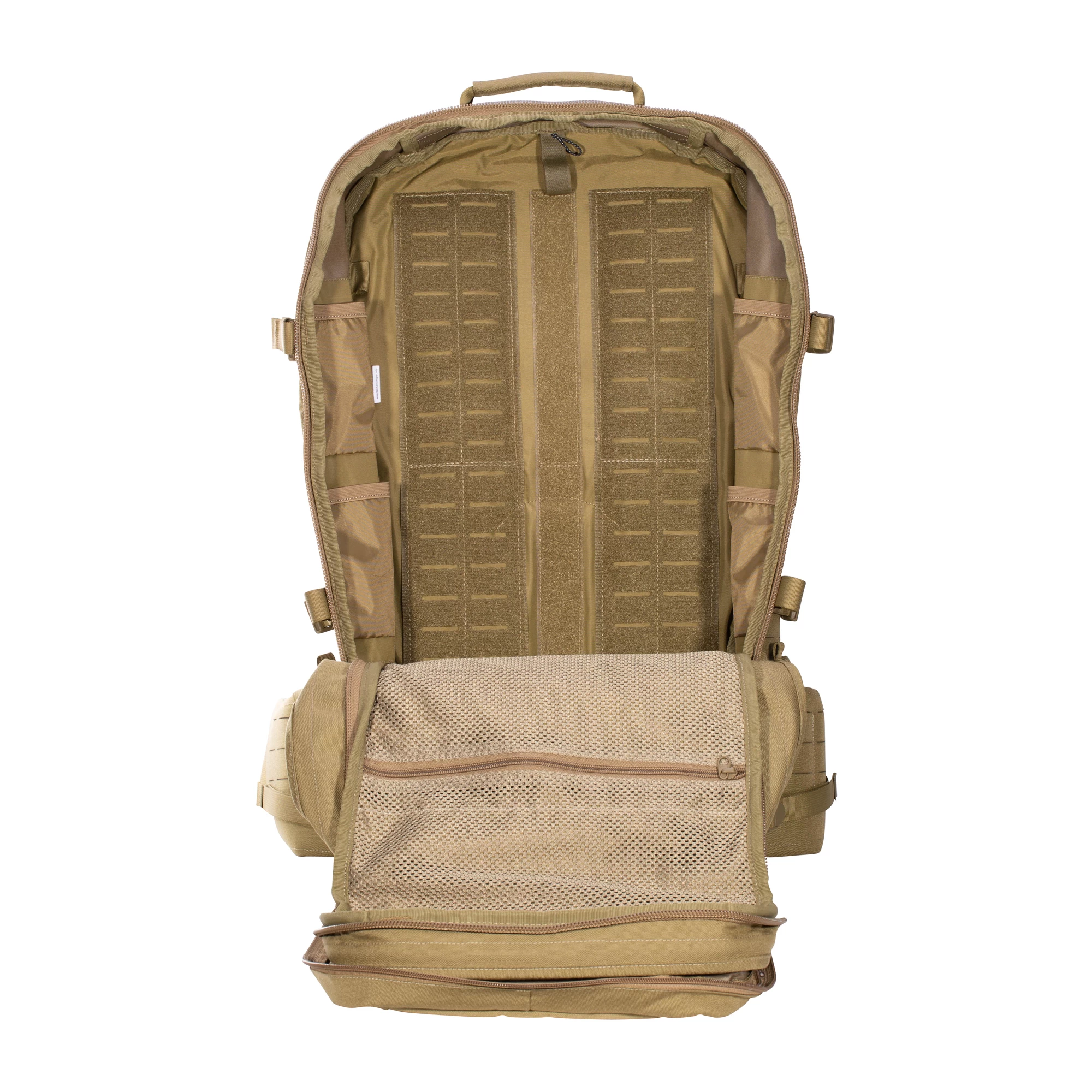 Der Deckel ist sowohl nach vorn und oben zu öffnen und ermöglicht so den Zugriff ins Hauptfach. Das erleichtert den Zugriff sowie das Packen der Ausrüstung, sodass der Rucksack als Toploader verwendet werden kann. Molle-Klett an den Rückwänden der Fächer bieten Platz für die modulare Erweiterung des Trooper Packs. Nützliche Ergänzungen wie die integrierte Regenhülle oder der abnehmbare Hüftgurt sorgen dafür, dass der Rucksack in unterschiedlichen Lebenslagen einsetzbar ist.