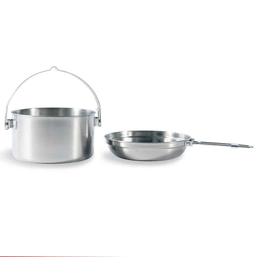Ein leichtes Edelstahlkochset bestehend aus einem Topf und einer Pfanne, welche zugleich als Deckel oder verbesserter Teller verwendet werden kann. Der Kochtopf hat ein Volumen von 1,6 Liter, verfügt zudem über eine Volumenskala im Inneren und einen Tragehenkel. Das gesamte Set ist aus 18/8 Edelstahl gefertigt, was es besonders langlebig, robust und pflegeleicht macht.