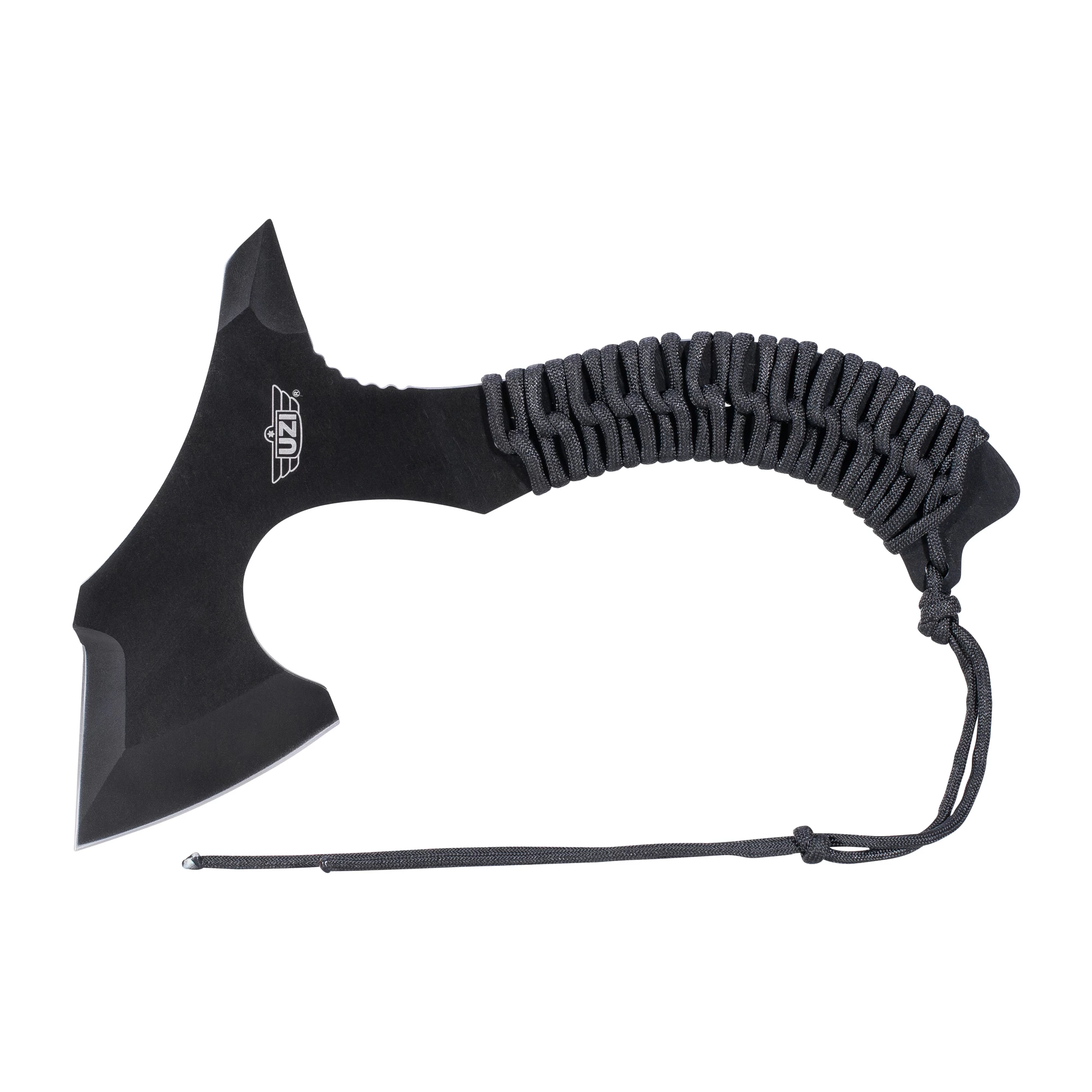 Die UZI Wurfaxt schwarz wird von Armeen, Geheimdiensten und Spezialeinheiten verwendet. Sie eignet sich perfekt zum Werfen und Haken. Sie verfügt neben einer breiten Klinge über eine verstärkte Schlagspitze und einen mit Fallschirmleine umwickelten Griff. Zudem hat sie eine zweischneidige Vorderseite und durchgehenden 4 Millimeter-Stahl.