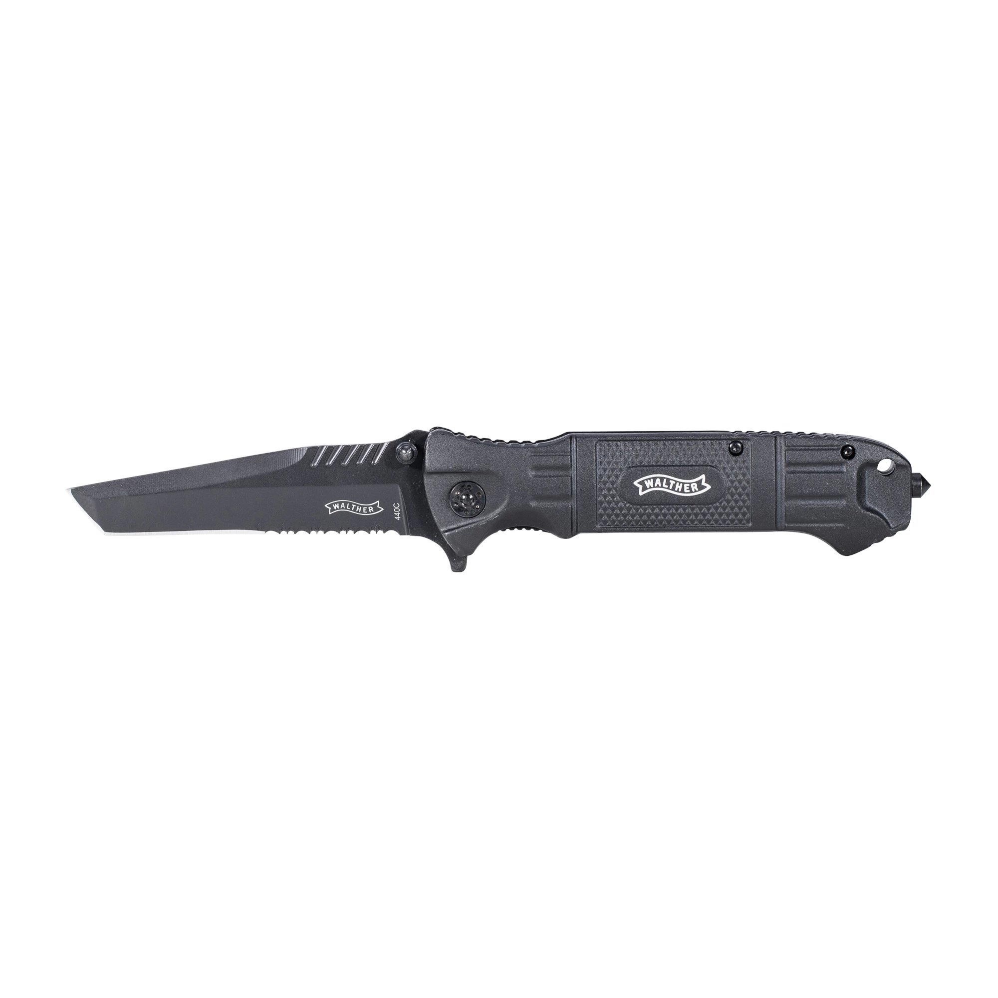 Einhandmesser mit Tantoklinge, die einen partiellen Wellenschliff aufweist. Durch den “Flipper” lässt sich das Taschenmesser blitzschnell und bequem öffnen. Die Klinge arretiert zuverlässig im Liner-Lock System. Am Ende des ergonomisch geformten Aluminiumgriffs befindet sich eine Öse für einen Fangriemen sowie ein Dorn als Glasbrecher. Der Gürtelclip ist beidseitig montierbar.